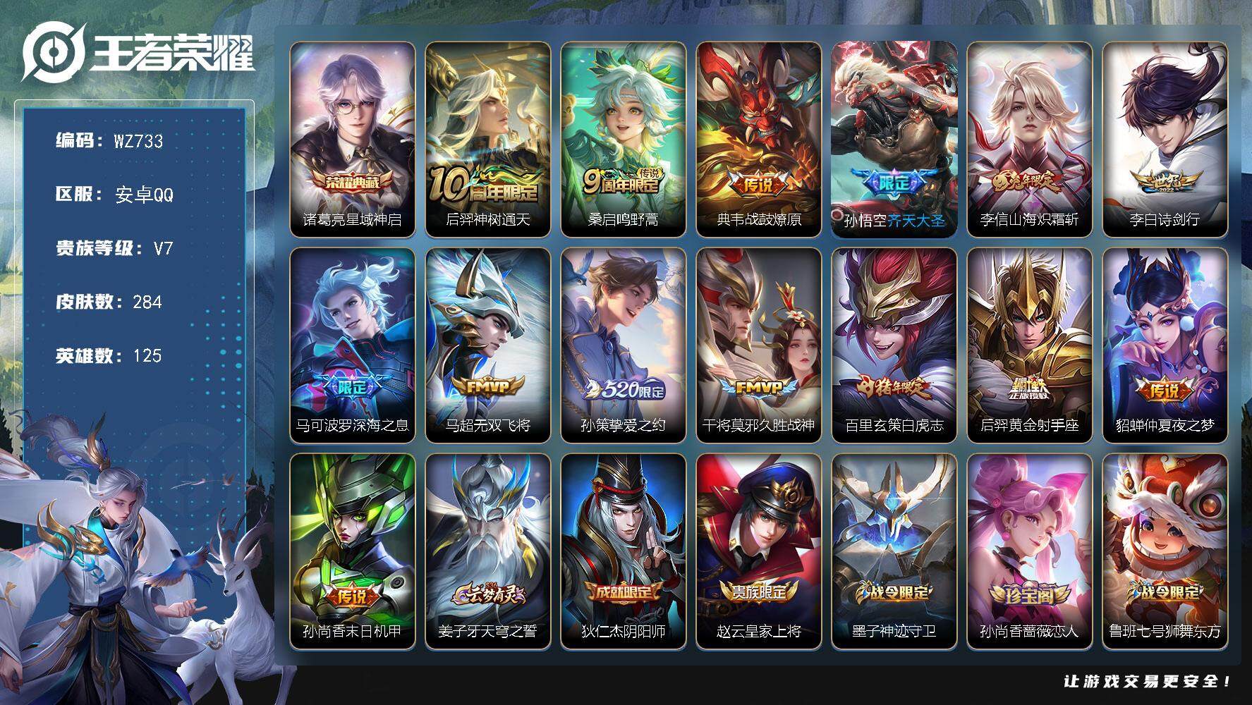 - [13078930]安卓Q-V8-永恒钻石I段位-126英雄-256皮肤-1典藏-0珍品无双-0无双-0珍品传说-10传说-75史诗 【英雄全皮】:戈娅全皮 【荣耀典藏】:夏侯惇无限飓风号 【传说皮肤】:云缨鹤归松栖,虞姬启明星使,虞姬云霓雀翎,百里玄策白虎志,花木兰冠军飞将,梦奇胖达荣荣,诸葛亮武陵仙君,貂蝉仲夏夜之梦,孙尚香末日机甲,孙悟空地狱火 【限定皮肤】:杨戬破阵退雄兵,狄仁杰阴阳师,赵云皇家上将,嬴政白昼王子,孙尚香蔷薇恋人,高渐离玩趣恶龙,阿轲迷踪丽影,钟无艳超时空战士,芈月重明,吕布猎兽之王,吕布御风骁将,周瑜赤莲之焰,元歌无心,夏侯惇朔风刀,甄姬落雪兰心,曹操烛龙,典韦穷奇,典韦蓝屏警告,马可波罗暗影游猎,马可波罗山海玄木吟,狄仁杰魔术师,狄仁杰万华元夜,项羽海滩派对,老夫子醍醐杖,程咬金演武夺筹,露娜一生所爱,刘邦夺宝奇兵,韩信逐梦之影,王昭君午后时光,兰陵王驯魔猎人,兰陵王金庭之子,孙悟空至尊宝,孙悟空大圣娶亲,牛魔御旌,后羿如梦令,李元芳银河之约,李元芳云中旅人,虞姬启明星使,钟馗驱傩正仪,杨玉环遇见飞天,女娲朔望之晖,雅典娜单词大作战,雅典娜黎明之约,蔡文姬繁星吟游,太乙真人饕餮,鬼谷子原初探秘者,鬼谷子五谷丰年,诸葛亮武陵仙君,百里玄策白虎志,百里玄策原初追逐者,弈星混沌棋,梦奇顽趣,公孙离蜜橘之夏,沈梦溪星空之诺,沈梦溪大漠名商,明世隐疑决卦,裴擒虎李小龙,裴擒虎擒涛扼浪,狂铁御狮,狂铁电玩高手,米莱狄御霄,云中君纤云弄巧,盾山御銮,猪八戒西部大镖客,上官婉儿梁祝,上官婉儿天狼绘梦者,嫦娥暖冬兔眠,西施玲珑珍味,蒙犽狂想玩偶喵,鲁班大师探海日志,桑启海盐诗旅,暃星界游侠,戈娅驭风魔法,艾琳流音漫舞,云缨鹤归松栖,司空震地狱燃心,阿古朵江河有灵,张良古海寻踪,蒙恬荣光圣徽,鬼谷子天穹祈灯,刘邦剑破天穹,周瑜熔金海岸 【年限皮肤】:百里玄策白虎志,吕布御风骁将,马可波罗山海玄木吟 【赛季限定】:芈月重明,夏侯惇朔风刀,曹操烛龙,典韦穷奇,狄仁杰万华元夜,老夫子醍醐杖,程咬金演武夺筹,兰陵王金庭之子,张良古海寻踪,牛魔御旌,李元芳云中旅人,钟馗驱傩正仪,雅典娜黎明之约,太乙真人饕餮,鬼谷子原初探秘者,百里玄策原初追逐者,弈星混沌棋,梦奇顽趣,沈梦溪大漠名商,明世隐疑决卦,裴擒虎擒涛扼浪,狂铁御狮,米莱狄御霄,盾山御銮,鲁班大师探海日志,桑启海盐诗旅,鬼谷子天穹