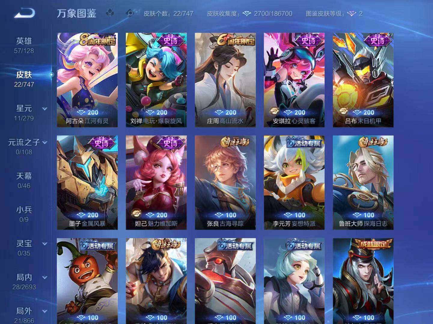 - PX_2051154-安卓V 【可二次】 英雄数量:123 皮肤数量:258 贵族等级:贵族V7 【万战小国标 哪吒】【对抗路70段 打野54段】【星传说 幽冥之眼】星域神启 拾光映像 怪盗基德 李逍遥 白虎志 淬星耀世 炽阳神光 浮生妄 挚爱之约 地狱之眼 黄金狮子座 黄金白羊座 鸣野蒿 逐花归海 乘龙淬吴钩 乘龙铭钟鼎 天才门将 心灵战警 功夫厨神 鬼剑武藏 魅力维加斯 皇家上将 繁星吟游 乱