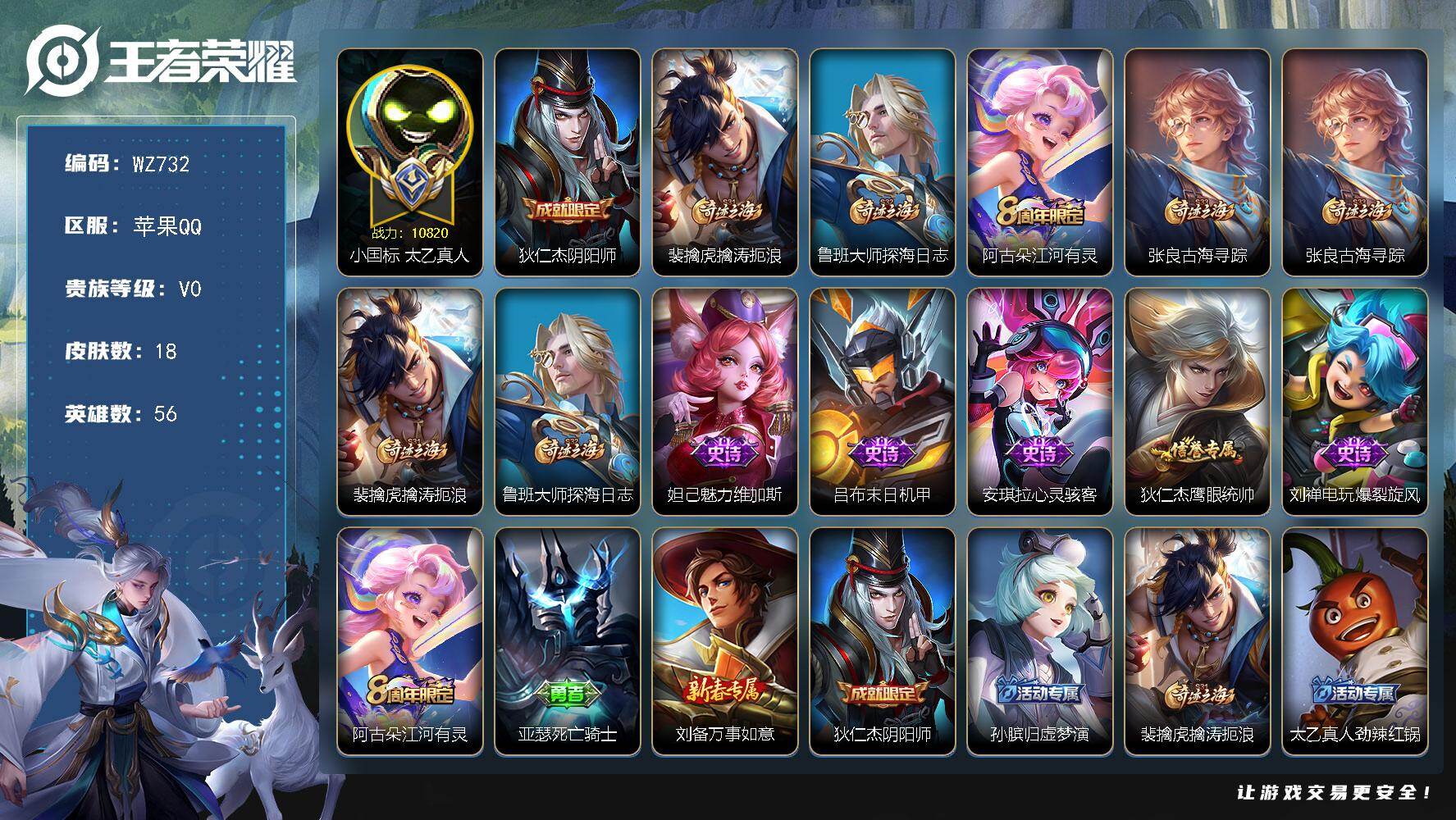 [14925269]小国标太乙真人,苹果Q-18皮肤-6史诗 【限定皮肤】:狄仁杰阴阳师,裴擒虎擒涛扼浪,鲁班大师探海日志,阿古朵江河有灵,张良古海寻踪 【赛季限定】:张良古海寻踪,裴擒虎擒涛扼浪,鲁班大师探海日志 【史诗皮肤】:妲己魅力维加斯,吕布末日机甲,安琪拉心灵骇客,狄仁杰鹰眼统帅,刘禅电玩爆裂旋风,阿古朵江河有灵 【其他皮肤】:亚瑟死亡骑士,刘备万事如意,狄仁杰阴阳师,孙膑归虚梦演,裴擒虎擒涛扼浪,太乙真人劲辣红锅,鲁班大师探海日志,李元芳妄想特派,张良古海寻踪,太乙真人圆桌骑士,苏烈爱与和平,桑启画中游 【营地ID】:1815034762 【小国标】:小国标太乙真人