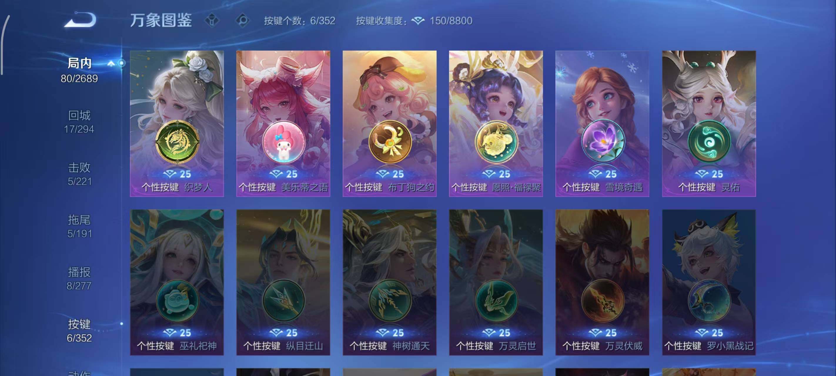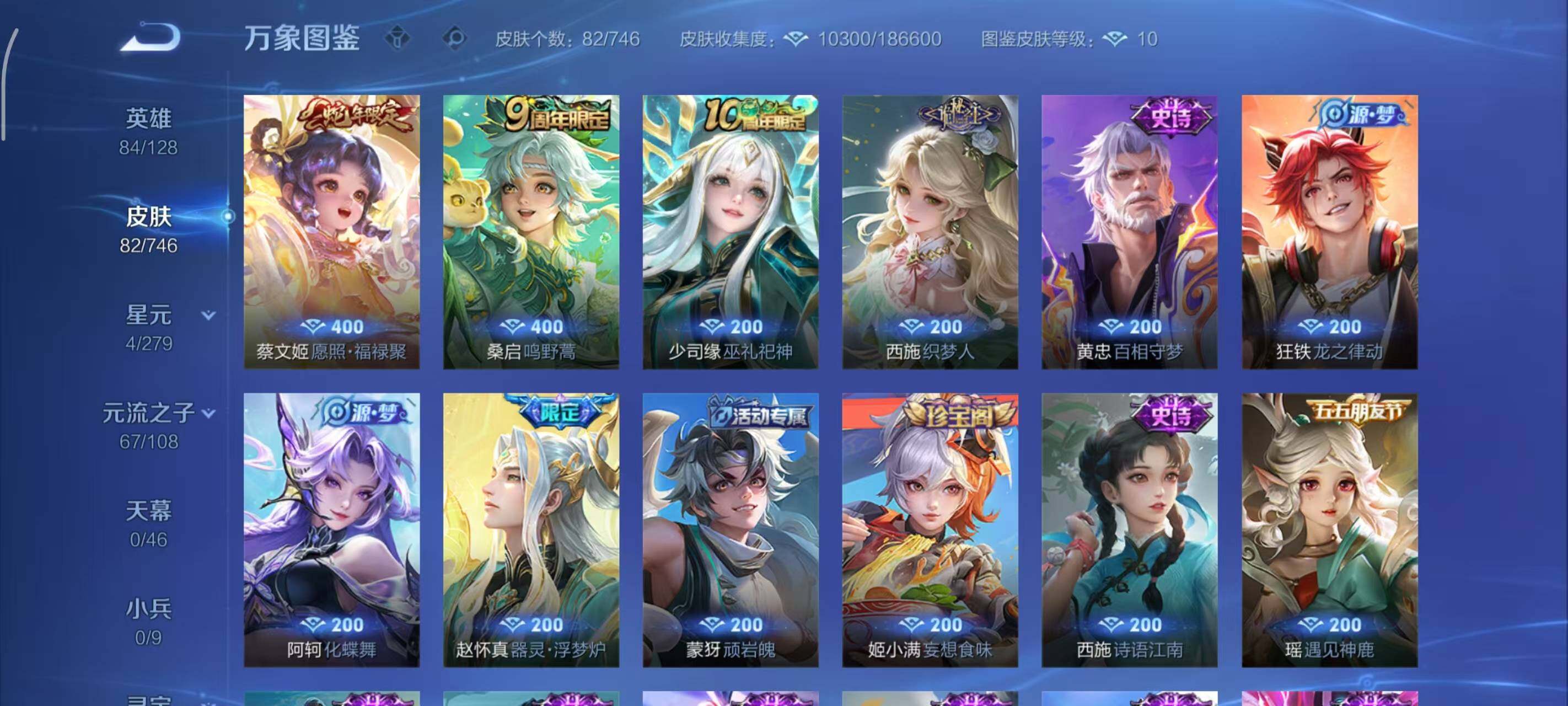 小乔青蛇,大乔白蛇,瑶遇见神鹿,阿轲节奏热浪,雅典娜冰冠公主,刘禅天才门将,安琪拉心灵骇客,蔡文姬舞动绿茵,西施诗语江南,小乔缤纷独角兽,花木兰水晶猎龙者,貂蝉圣诞恋歌,赵怀真器灵·浮梦炉