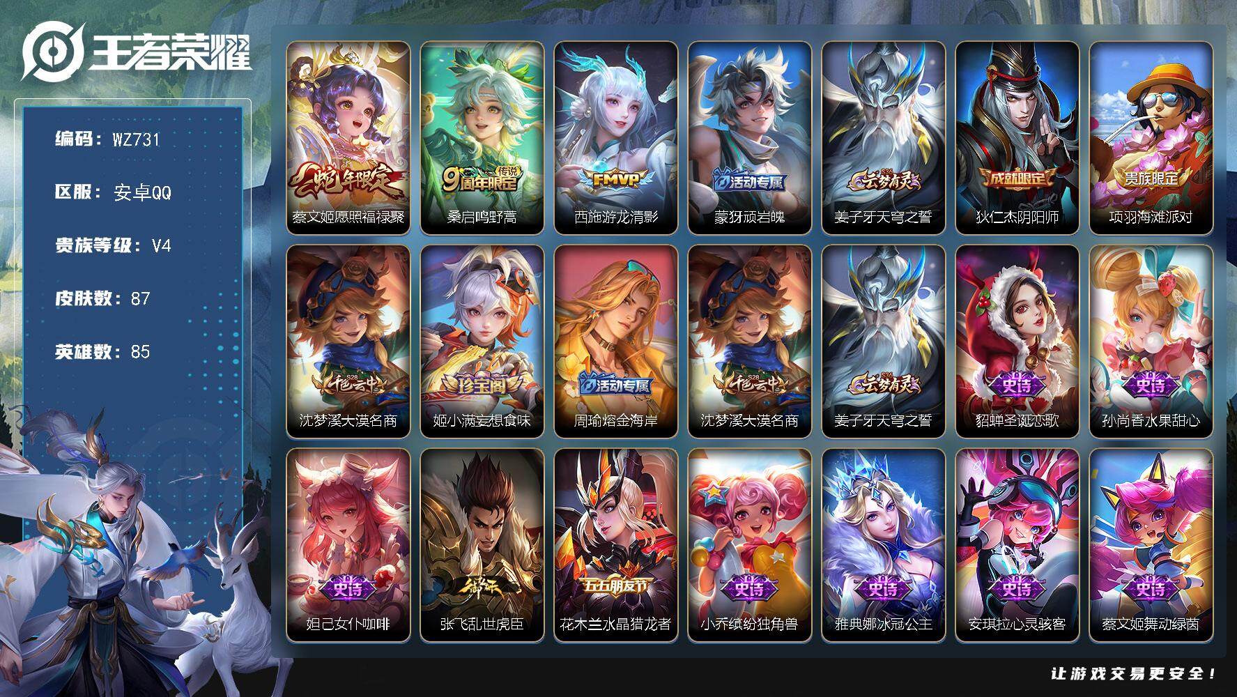 [14925593]安卓Q 87皮肤-3传说-24史诗 【传说皮肤】:蔡文姬愿照福禄聚,桑启鸣野蒿,西施游龙清影 【限定皮肤】:蒙犽顽岩魄,姜子牙天穹之誓,狄仁杰阴阳师,项羽海滩派对,沈梦溪大漠名商,姬小满妄想食味,周瑜熔金海岸 【赛季限定】:沈梦溪大漠名商,姜子牙天穹之誓 【史诗皮肤】:貂蝉圣诞恋歌,孙尚香水果甜心,妲己女仆咖啡,张飞乱世虎臣,花木兰水晶猎龙者,小乔缤纷独角兽,雅典娜冰冠公主,安琪拉心灵骇客,蔡文姬舞动绿茵,刘禅天才门将,阿轲节奏热浪,狄仁杰鹰眼统帅,大乔白蛇,小乔青蛇,瑶遇见神鹿,西施诗语江南,姬小满妄想食味,蒙犽顽岩魄,赵怀真器灵浮梦炉,阿轲化蝶舞,狂铁龙之律动,黄忠百相守梦,西施织梦人,少司缘巫礼祀神 【其他皮肤】:项羽海滩派对,露娜哥特玫瑰,阿轲爱心护理,白起白色死神,安琪拉玩偶对对碰,妲己少女阿狸,亚瑟死亡骑士,达摩拳王,甄姬花好人间,后羿阿尔法小队,狄仁杰阴阳师,钟无艳海滩丽影,孙尚香沉稳之力,诸葛亮掌控之力,李白敏锐之力,大乔守护之力,明世隐虹云星官,鲁班大师乓乓大师,沈梦溪大漠名商,姬小满零食大作战,朵莉亚金色潮汐,姜子牙天穹之誓,周瑜熔金海岸,盘古敬我三分,东皇太一噬灭天穹,干将莫邪雾都夜雨,苍苍林狼骑,太乙真人谧流熔炉,典韦铁骨偃魂,西施雪境奇遇,姜子牙星梦巡礼,少司缘灵卦秘语,明世隐景韶洛都,戈娅玫蓝誓约,刘备浪漫序章,钟馗虚灵犬护,苏烈春野闲踪,小乔秘证寻踪,张良灵野札记,阿古朵布丁狗之约,露娜命运加冕,姬小满小满鸭,甄姬逆浪荇歌,亚瑟荣光之誓,艾琳鹤鸣心笺,蚩奼极光幻客,项羽帝国元帅,王昭君精灵公主,小乔万圣前夜,马可波罗激情绿茵,太乙真人圆桌骑士,大乔伊势巫女,百里玄策威尼斯狂欢,女娲尼罗河女神,公孙离花间舞,米莱狄精准探案法,嫦娥露花倒影,西施归虚梦演,鲁班大师归虚梦演,暃碧珀绯影 【营地ID】:1651843673