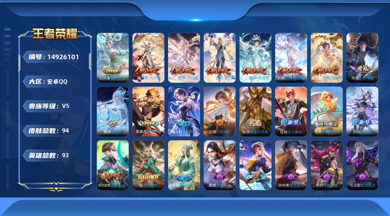 [14926101]12按键 满蛇年 安卓Q-94皮肤-13传说-27史诗 【英雄全皮】:影全皮 【传说皮肤】:公孙离云诺千山,杨玉环星之鸣奏,司空震愿照山河定,女娲愿照千秋盛,妲己愿照众生和,澜愿照九州拓,蔡文姬愿照福禄聚,虞姬愿照岁时盈,云缨幻光神枪,裴擒虎祥瑞亨通,露娜霜月吟,李信一念神魔,张良黄金白羊座 【限定皮肤】:狄仁杰阴阳师,赵云皇家上将,马可波罗山海玄木吟,狄仁杰魔术师,项羽海滩派对,桑启海盐诗旅 【年限皮肤】:马可波罗山海玄木吟 【赛季限定】:桑启海盐诗旅 【史诗皮肤】:露娜紫霞仙子,阿轲暗夜猫娘,赵云皇家上将,貂蝉圣诞恋歌,王昭君偶像歌手,狄仁杰魔术师,宫本武藏鬼剑武藏,嬴政摇滚巨星,安琪拉心灵骇客,百里守约特工魅影,白起星夜王子,阿轲节奏热浪,伽罗箭羽风息,狄仁杰鹰眼统帅,公孙离无限星赏官,瑶遇见神鹿,孙尚香时之恋人,司马懿暗渊魔法,夏洛特永昼,马可波罗山海玄木吟,百里守约百相守梦,孙膑茶境仙,姬小满飞车小橘子,赵怀真器灵浮梦炉,阿轲化蝶舞,刘禅鸭鸭历险记,狂铁龙之律动 【其他皮肤】:项羽海滩派对,韩信街头霸王,露娜哥特玫瑰,白起白色死神,典韦黄金武士,花木兰兔女郎,狄仁杰阴阳师,刘备汉昭烈帝,苏烈坚韧之力,桑启海盐诗旅,姬小满零食大作战,东皇太一噬灭天穹,老夫子百相守梦,苍苍林狼骑,太乙真人谧流熔炉,典韦铁骨偃魂,马超访茗客,影魅影绮裳,西施雪境奇遇,达摩爆裂喵拳,少司缘灵卦秘语,明世隐景韶洛都,戈娅玫蓝誓约,刘备浪漫序章,钟馗虚灵犬护,沈梦溪鸭鸭历险记,苏烈春野闲踪,小乔秘证寻踪,张良灵野札记,阿古朵布丁狗之约,甄姬逆浪荇歌,莱西奥踏浪烽翎,哪吒罗小黑战记,鲁班七号木偶奇遇记,露娜绯红之刃,貂蝉异域舞娘,王昭君精灵公主,夏侯惇战争骑士,马可波罗激情绿茵,太乙真人圆桌骑士,干将莫邪第七人偶,铠龙域领主,百里守约绝影神枪,公孙离花间舞,裴擒虎街头旋风,米莱狄精准探案法,元歌午夜歌剧院,司马懿魇语军师,李信灼热之刃,盘古创世神祝,马超幸存者,西施归虚梦演,镜冰刃幻境,司空震启蛰 【营地ID】:1622357750
