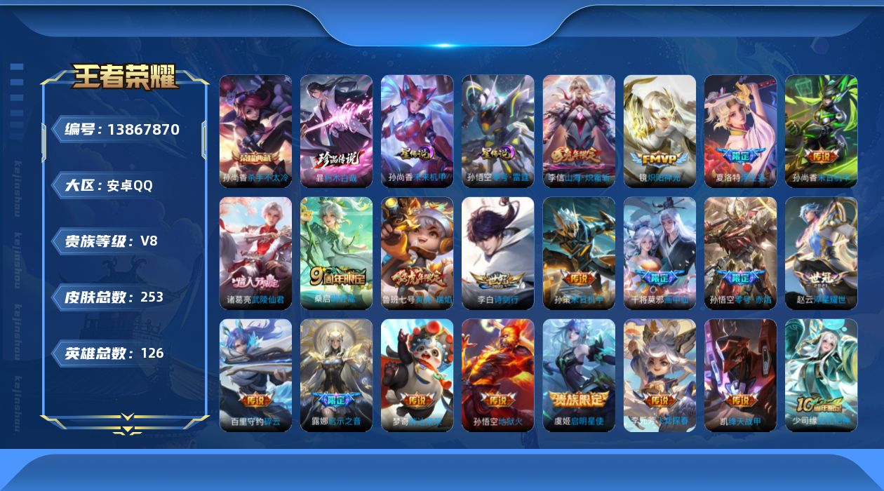 [13867870]安卓Q-V8-126英雄-252皮肤-1典藏-19传说-67史诗