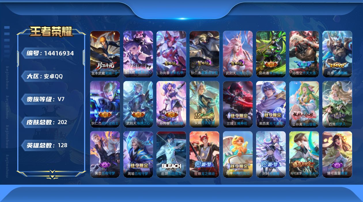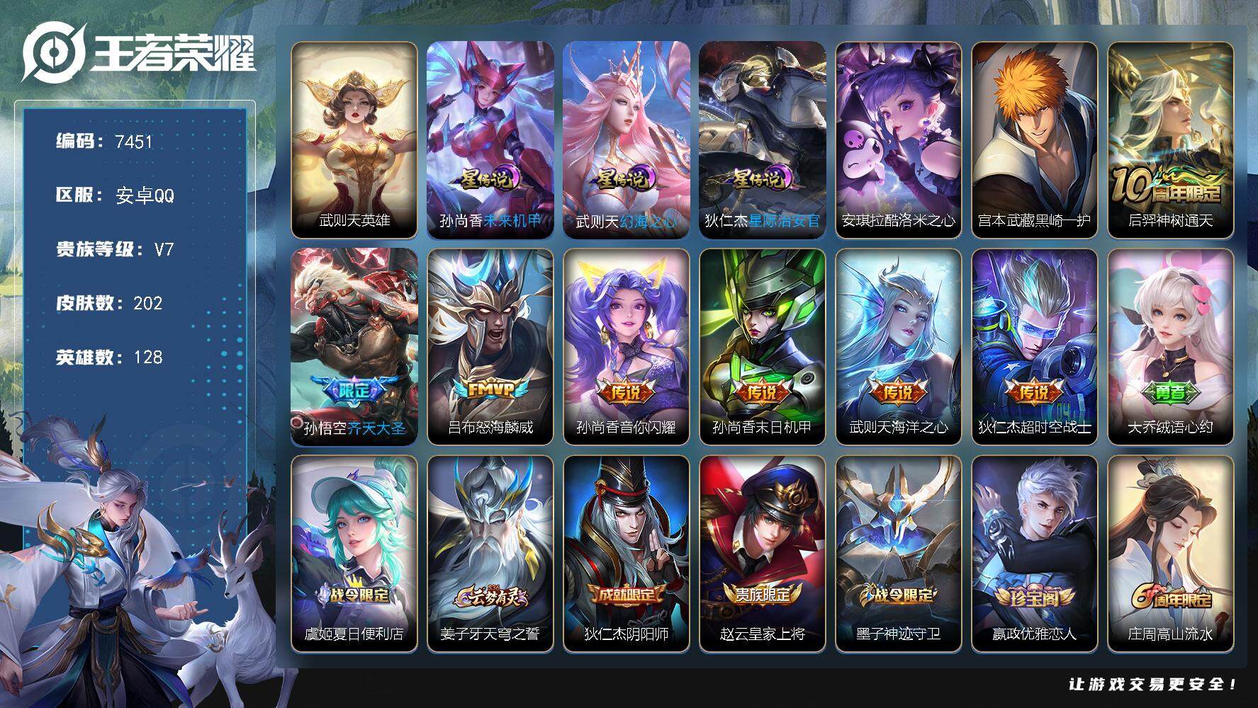 [14416934]安卓Q-V7-至尊星耀I段位-128英雄-202皮肤-2珍品传说-7传说-59史诗 【英雄全皮】:孙权全皮 【荣耀典藏】:武则天英雄 【珍品传说】:安琪拉酷洛米之心,宫本武藏黑崎一护 【传说皮肤】:后羿神树通天,孙悟空齐天大圣,吕布怒海麟威,孙尚香音你闪耀,孙尚香末日机甲,武则天海洋之心,狄仁杰超时空战士 【限定皮肤】:大乔绒语心约,虞姬夏日便利店,姜子牙天穹之誓,狄仁杰阴阳师,赵云皇家上将,墨子神迹守卫,嬴政优雅恋人,庄周高山流水,高渐离玩趣恶龙,白起夜都怪侠,芈月幻夜卜梦,吕布猎兽之王,马可波罗山海玄木吟,狄仁杰魔术师,达摩星际陆战队,达摩沙漠行僧,项羽海滩派对,老夫子航海奇遇记,程咬金演武夺筹,王昭君午后时光,兰陵王金庭之子,孙悟空齐天大圣,后羿圣弓游侠,李元芳云中旅人,钟馗驱傩正仪,干将莫邪真爱魔法,鬼谷子五谷丰年,黄忠火炮绅士,苏烈千军破阵,梦奇顽趣,沈梦溪大漠名商,明世隐吟游魔法,裴擒虎擒涛扼浪,狂铁电玩高手,嫦娥暖冬兔眠,西施玲珑珍味,鲁班大师探海日志,桑启海盐诗旅,暃星界游侠,戈娅驭风魔法,艾琳流音漫舞,张良古海寻踪,蒙恬荣光圣徽,高渐离燃音魔法,妲己灵卜魔法,鬼谷子天穹祈灯,伽罗琥珀纪元,李元芳蔬乡物语,镜青焰无极,项羽苍威无极,周瑜熔金海岸 【年限皮肤】:马可波罗山海玄木吟 【赛季限定】:达摩沙漠行僧,程咬金演武夺筹,兰陵王金庭之子,张良古海寻踪,李元芳云中旅人,钟馗驱傩正仪,苏烈千军破阵,梦奇顽趣,沈梦溪大漠名商,裴擒虎擒涛扼浪,鲁班大师探海日志,桑启海盐诗旅,鬼谷子天穹祈灯,蒙恬荣光圣徽,姜子牙天穹之誓 【战令限定】:墨子神迹守卫,虞姬夏日便利店,白起夜都怪侠,芈月幻夜卜梦,吕布猎兽之王,达摩星际陆战队,老夫子航海奇遇记,王昭君午后时光,艾琳流音漫舞,后羿圣弓游侠,干将莫邪真爱魔法,黄忠火炮绅士,明世隐吟游魔法,狂铁电玩高手,嫦娥暖冬兔眠,西施玲珑珍味,暃星界游侠,戈娅驭风魔法,高渐离燃音魔法,妲己灵卜魔法,李元芳蔬乡物语,镜青焰无极,项羽苍威无极 【史诗皮肤】:鲁班七号电玩小子,项羽苍穹之光,阿轲暗夜猫娘,赵云皇家上将,甄姬冰雪圆舞曲,王昭君偶像歌手,狄仁杰魔术师,廉颇地狱岩魂,宫本武藏鬼剑武藏,孙尚香水果甜心,嬴政优雅恋人,嬴政摇滚巨星,妲己魅力维加斯,吕布圣诞狂欢,曹操幽灵船长,李白千年之狐,花木兰水晶猎龙者,刘邦德古拉伯爵,夏侯惇乘