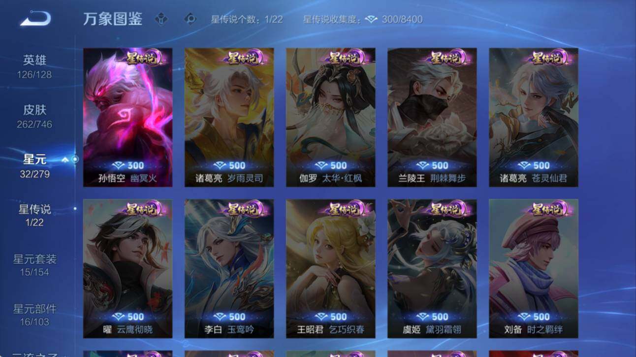 米莱狄御霄,牛魔御旌,盾山御銮,夏侯惇朔风刀,明世隐疑决卦,老夫子醍醐杖,鬼谷子原初探秘者,狄仁杰万华元夜,钟馗驱傩正仪,苏烈千军破阵,吕布猎兽之王,钟馗神迹守卫,鲁班七号狮舞东方,马可波罗暗影游猎,蒙犽狂想玩偶喵,元歌云间偶戏,弈星混沌棋,达摩沙漠行僧,兰陵王金庭之子,沈梦溪大漠名商,李元芳云中旅人,桑启海盐诗旅,裴擒虎擒涛扼浪,鲁班大师探海日志,张良古海寻踪