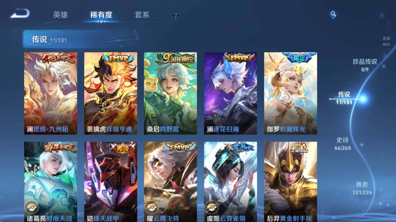 【传说皮肤】:澜愿照九州拓,裴擒虎祥瑞亨通,桑启鸣野蒿,澜逐花归海,伽罗炽翼辉光,诸葛亮时雨天司,铠绛天战甲,曜云鹰飞将,虞姬云霓雀翎,后羿黄金射手座,孙悟空地狱火
