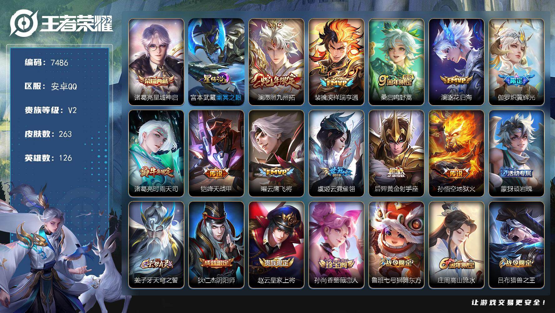 - [14513170]【店主推荐捡漏号!可直接换绑】安卓Q-V7-最强王者段位-125英雄-207皮肤-6传说-66史诗 【传说皮肤】:女娲愿照千秋盛,虞姬愿照岁时盈,伽罗炽翼辉光,孙悟空零号赤焰,虞姬云霓雀翎,宫本武藏地狱之眼 【限定皮肤】:白起狰,大乔绒语心约,狄仁杰阴阳师,虞姬凯尔特女王,赵云皇家上将,赵云引擎之心,墨子神迹守卫,妲己时之奇旅,孙尚香蔷薇恋人,高渐离死亡摇滚,白起夜都怪侠,芈月重明,夏侯惇朔风刀,曹操烛龙,典韦穷奇,狄仁杰魔术师,狄仁杰万华元夜,达摩沙漠行僧,项羽海滩派对,老夫子航海奇遇记,王昭君午后时光,兰陵王金庭之子,亚瑟潮玩骑士王,孙悟空至尊宝,孙悟空零号赤焰,后羿圣弓游侠,李元芳云中旅人,钟馗驱傩正仪,杨玉环遇见飞天,杨戬潮玩骑兵,干将莫邪真爱魔法,太乙真人饕餮,苏烈千军破阵,弈星混沌棋,沈梦溪大漠名商,裴擒虎擒涛扼浪,狂铁御狮,狂铁电玩高手,伽罗天狼溯光者,伽罗炽翼辉光,嫦娥拒霜思,鲁班大师探海日志,桑启海盐诗旅,戈娅驭风魔法,鬼谷子天穹祈灯,周瑜熔金海岸 【年限皮肤】:伽罗炽翼辉光 【赛季限定】:白起狰,芈月重明,夏侯惇朔风刀,曹操烛龙,典韦穷奇,狄仁杰万华元夜,达摩沙漠行僧,兰陵王金庭之子,李元芳云中旅人,虞姬凯尔特女王,钟馗驱傩正仪,太乙真人饕餮,苏烈千军破阵,弈星混沌棋,沈梦溪大漠名商,裴擒虎擒涛扼浪,狂铁御狮,鲁班大师探海日志,桑启海盐诗旅,鬼谷子天穹祈灯 【战令限定】:墨子神迹守卫,白起夜都怪侠,老夫子航海奇遇记,王昭君午后时光,亚瑟潮玩骑士王,后羿圣弓游侠,杨戬潮玩骑兵,干将莫邪真爱魔法,狂铁电玩高手,戈娅驭风魔法 【史诗皮肤】:鲁班七号电玩小子,露娜紫霞仙子,赵云皇家上将,赵云未来纪元,貂蝉圣诞恋歌,甄姬冰雪圆舞曲,狄仁杰魔术师,廉颇地狱岩魂,宫本武藏鬼剑武藏,孙尚香蔷薇恋人,孙尚香水果甜心,嬴政暗夜贵公子,嬴政摇滚巨星,妲己魅力维加斯,妲己女仆咖啡,墨子龙骑士,墨子金属风暴,吕布圣诞狂欢,刘禅绅士熊喵,曹操幽灵船长,李白千年之狐,吕布末日机甲,张飞乱世虎臣,韩信白龙吟,孙悟空至尊宝,赵云引擎之心,花木兰水晶猎龙者,刘邦德古拉伯爵,夏侯惇乘风破浪,小乔缤纷独角兽,兰陵王暗隐猎兽者,亚瑟心灵战警,雅典娜冰冠公主,安琪拉心灵骇客,铠曙光守护者,蔡文姬舞动绿茵,李元芳逐浪之夏,程咬金功夫厨神,白起星夜王子,阿轲节奏热浪,杨玉环遇见飞天,孙策猫狗