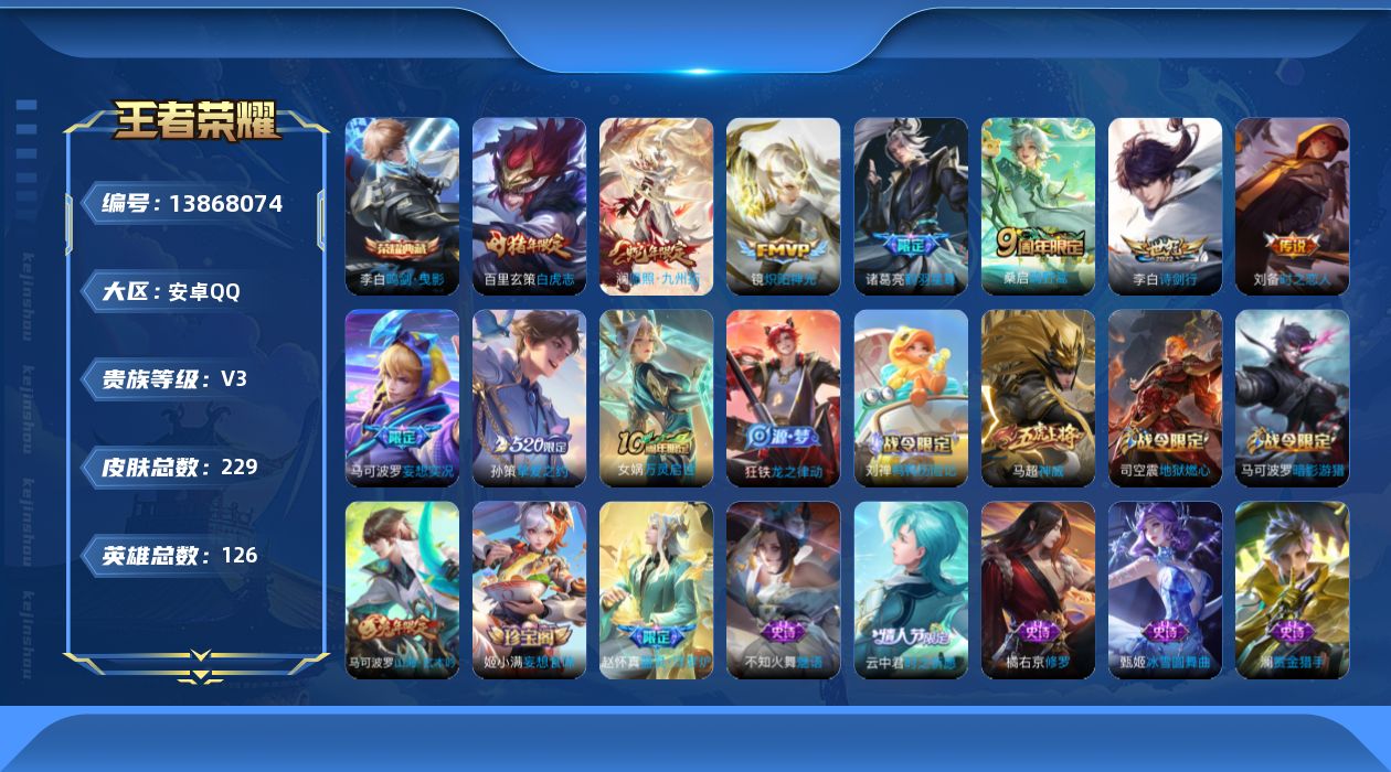 [13868074]金标李白 刘备安卓Q-V3-225皮肤-1典藏-9传说-62史诗