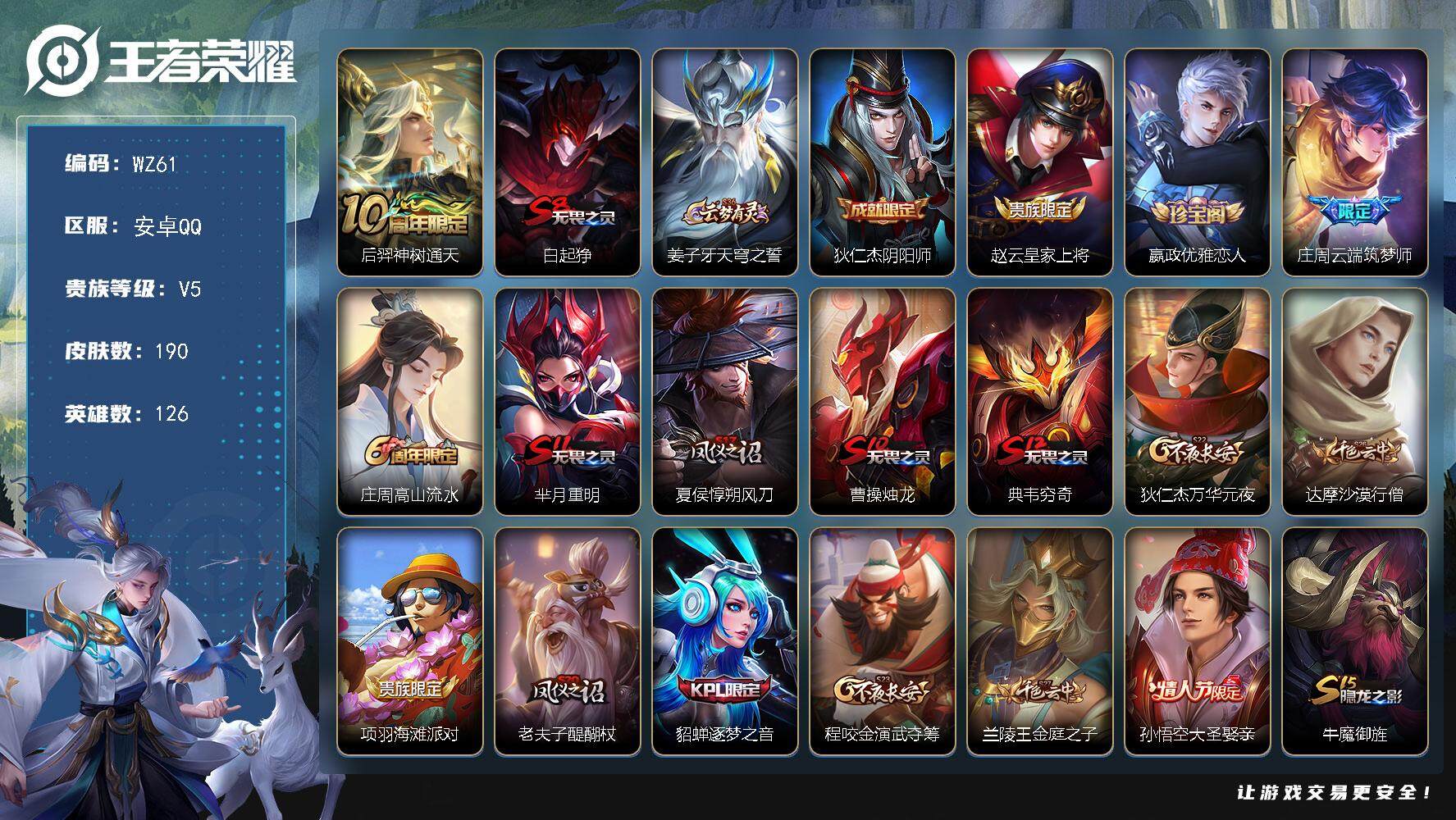 - [14514108]【店主推荐捡漏号!可直接换绑】安卓Q-V8-最强王者段位-127英雄-270皮肤-1典藏皮肤-3珍品传说-1星传说-15传说-77史诗 【英雄全皮】:影全皮 【荣耀典藏】:关羽赤影疾锋 【珍品传说】:马可波罗怪盗基德,鲁班七号江户川柯南,孙策时之奇旅 【传说皮肤】:后羿神树通天,澜愿照九州拓,虞姬愿照岁时盈,裴擒虎祥瑞亨通,嬴政玄雷天君,桑启鸣野蒿,澜逐花归海,马超无双飞将,赵云淬星耀世,虞姬启明星使,李信一念神魔,达摩黄金狮子座,百里玄策白虎志,后羿黄金射手座,宫本武藏地狱之眼 【限定皮肤】:白起狰,李白谪仙醉月,狄仁杰阴阳师,虞姬凯尔特女王,赵云皇家上将,墨子神迹守卫,嬴政白昼王子,孙尚香蔷薇恋人,鲁班七号狮舞东方,庄周蜃楼王,庄周高山流水,高渐离死亡摇滚,孙膑妖精王,扁鹊炼金王,芈月重明,吕布猎兽之王,周瑜赤莲之焰,夏侯惇朔风刀,曹操烛龙,典韦穷奇,典韦蓝屏警告,马可波罗逐梦之星,狄仁杰魔术师,狄仁杰万华元夜,项羽海滩派对,老夫子圣诞老人,老夫子醍醐杖,老夫子航海奇遇记,关羽冰锋战神,程咬金演武夺筹,兰陵王驯魔猎人,花木兰瑞麟志,亚瑟狮心王,孙悟空至尊宝,孙悟空孙行者,牛魔御旌,李元芳银河之约,虞姬启明星使,钟馗神迹守卫,钟馗驱傩正仪,杨玉环遇见飞天,女娲朔望之晖,太乙真人饕餮,鬼谷子原初探秘者,铠青龙志,苏烈玄武志,苏烈千军破阵,百里玄策白虎志,百里玄策原初追逐者,百里守约朱雀志,弈星混沌棋,沈梦溪星空之诺,沈梦溪大漠名商,明世隐疑决卦,裴擒虎天狼狩猎者,裴擒虎李小龙,狂铁御狮,米莱狄御霄,伽罗天狼溯光者,盾山御銮,猪八戒猪悟能,上官婉儿梁祝,张良古海寻踪,鬼谷子天穹祈灯,沈梦溪龙舞盛年 【年限皮肤】:百里玄策白虎志,百里守约朱雀志,花木兰瑞麟志,铠青龙志,苏烈玄武志 【赛季限定】:庄周蜃楼王,孙膑妖精王,扁鹊炼金王,白起狰,芈月重明,夏侯惇朔风刀,曹操烛龙,典韦穷奇,狄仁杰万华元夜,老夫子醍醐杖,程咬金演武夺筹,张良古海寻踪,亚瑟狮心王,牛魔御旌,虞姬凯尔特女王,钟馗驱傩正仪,太乙真人饕餮,鬼谷子原初探秘者,苏烈千军破阵,百里玄策原初追逐者,弈星混沌棋,沈梦溪大漠名商,明世隐疑决卦,狂铁御狮,米莱狄御霄,盾山御銮,鬼谷子天穹祈灯 【战令限定】:墨子神迹守卫,嬴政白昼王子,鲁班七号狮舞东方,吕布猎兽之王,周瑜赤莲之焰,典韦蓝屏警告,老夫子航海奇遇记,兰陵王