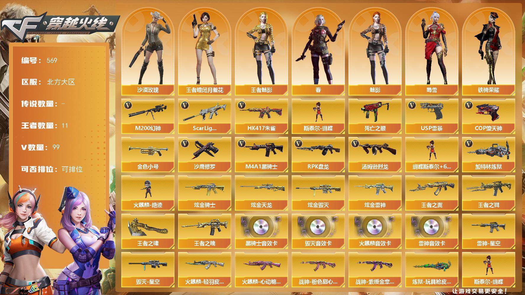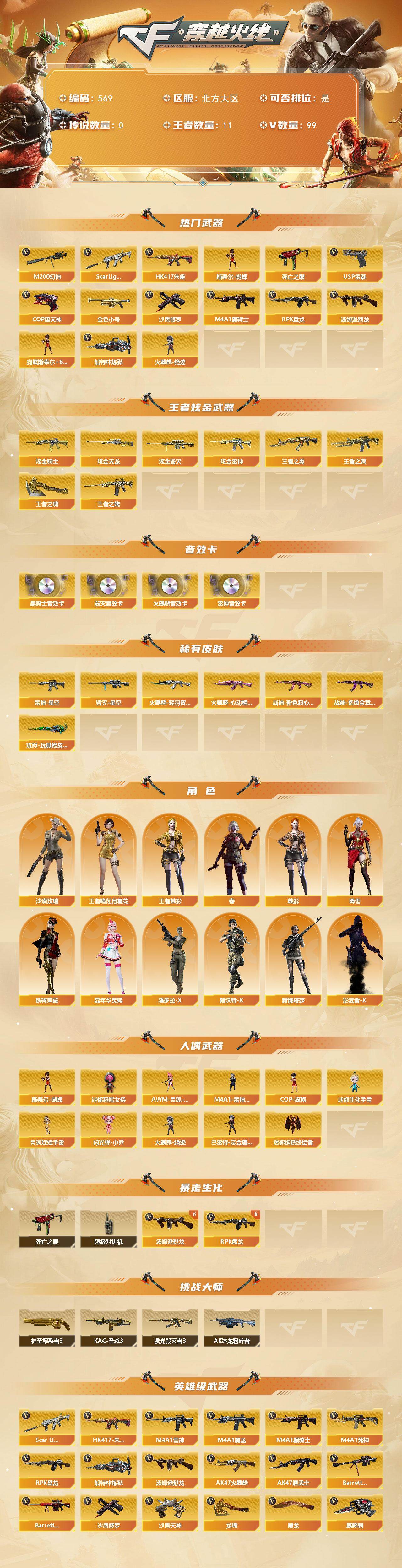 [14930372]北方大区-99V-11王者-5炫金 【热门武器】:Scar Light-白虎,HK417-朱雀,M200-幻神,死亡之眼,金色小号,M4A1-黑骑士,汤姆逊-烈龙*6,RPK-盘龙*6,加特林-炼狱,斯泰尔-蝴蝶,火麒麟-绝迹,USP-雷暴*2,COP-堕天神,沙鹰-修罗*2 【王者炫金武器】:王者之戮,王者之翼,王者之魄*2,王者之啸,炫金骑士*2,炫金雷神,炫金毁灭,炫金天龙 【音效卡】:AK47-火麒麟音效卡,M4A1-雷神音效卡,M4A1-黑骑士音效卡,Barrett-毁灭音效卡 【皮肤】:雷神-星空,火麒麟-轻羽皮肤,火麒麟-心动糖果,毁灭-星空,战神-粉色甜心皮肤*5,战神-紫绶金章皮肤*7,炼狱-玩具枪皮肤 【角色】:魅影,春,沙漠玫瑰,王者-瞳-闭月羞花,王者-魅影,嘉年华灵狐,潘多拉-X,斯沃特-X,蜀雪,铁骑荣耀,新娜塔莎,影武者-X 【人偶武器】:火麒麟-绝迹,M4A1-雷神-精英刀锋,迷你钢铁终结者,斯泰尔-蝴蝶,AWM-灵狐-15周年嘉年华,COP-旗袍,迷你生化手雷*3,闪光弹-小乔,巴雷特-赏金猎人,迷你超能女侍,灵狐娃娃手雷 【暴走生化】:死亡之眼,超级对讲机 【挑战大师】:神圣爆裂者III,AK47-冰龙粉碎者,激光毁灭者III,KAC-圣炎切割者III 【英雄级武器】:M4A1-千变,AK47-火麒麟*3,M4A1-黑龙,M4A1-雷神,M4A1-黑骑士,M4A1-死神,AK47-黑武士,AK47-机械迷城,AK47-雷暴,HK417-朱雀,Scar Light-白虎,无影-神兵利器,M4A1-猎神,王者之心-觉醒版,王者之魄-觉醒版,王者之势-觉醒版,AK47-B-战神,王者之鲨-觉醒版,黑骑士-海王,Barrett-毁灭,Barrett-极光*2,M200-幻神,Barrett-朱雀,Barrett-电竞装甲,王者之怒-觉醒版,RPK-盘龙*6,加特林-炼狱,汤姆逊-烈龙*6,沙鹰-修罗*2,沙鹰-天神,USP-雷暴*2,COP-堕天神,柯尔特-电竞装甲,破空枪刃-夜魔*2,屠龙*2,龙啸,麒麟刺,尼泊尔-电竞装甲,斩神刀-雷暴,王者之击-觉醒版,高爆手雷-雷暴*7,闪光弹-雷暴*7,烟雾弹-雷暴*7,M4A1-赤狱骑士 【道具】:EP战队炫彩背包,云山科技背包,超级背包*2,女皇终结者-魔龙之吻,妩媚妖姬,黄金生化钩,绿色