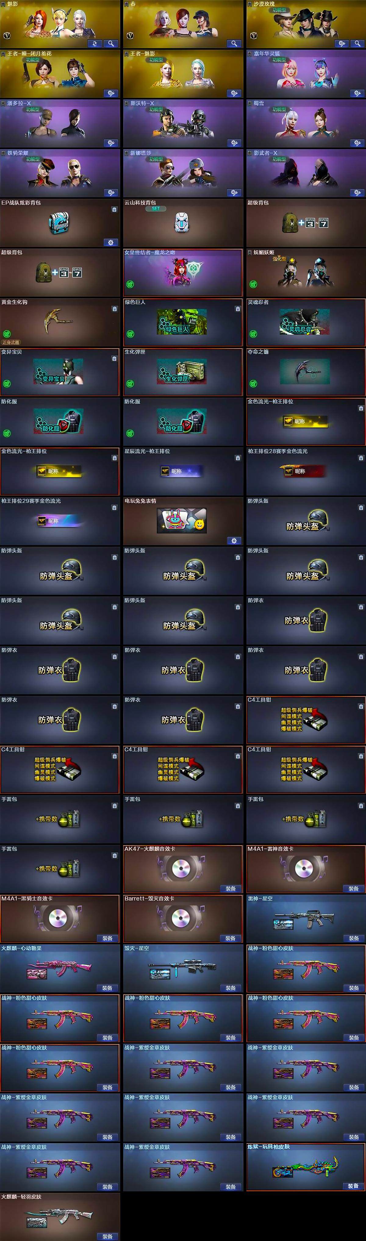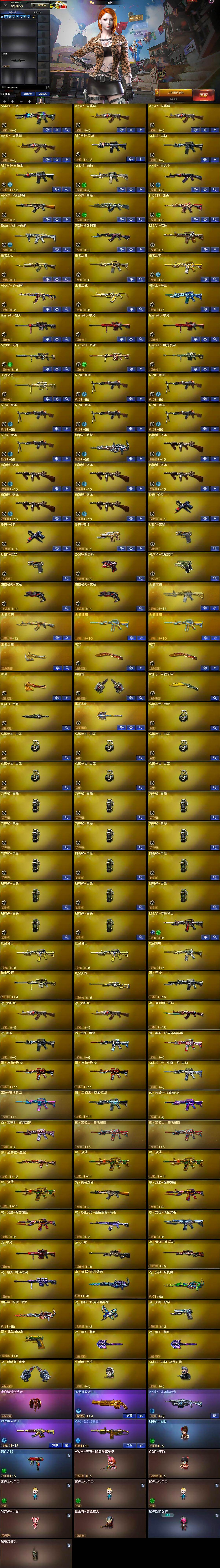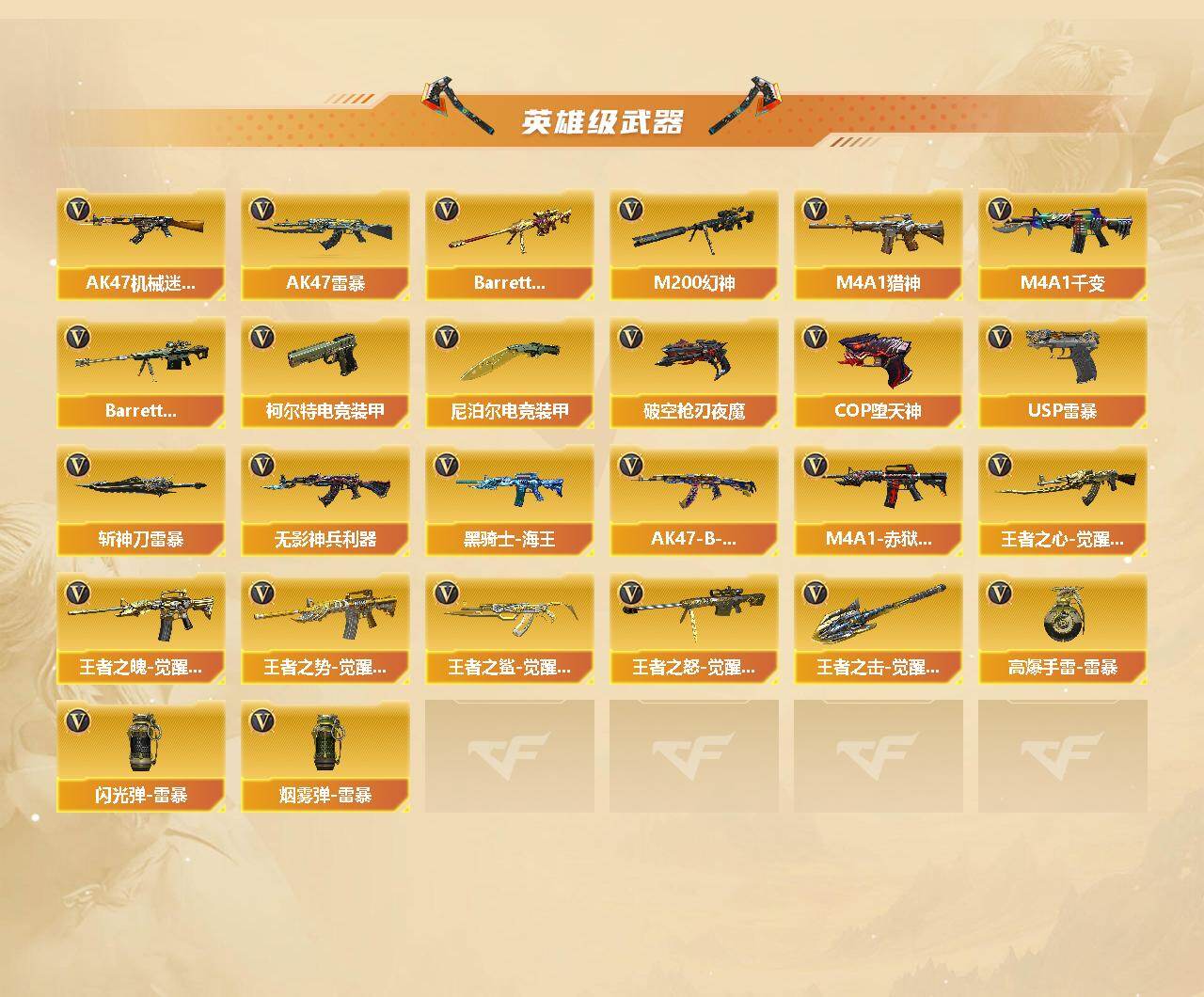 【英雄级武器】:M4A1-千变,AK47-火麒麟*3,M4A1-黑龙,M4A1-雷神,M4A1-黑骑士,M4A1-死神,AK47-黑武士,AK47-机械迷城,AK47-雷暴,HK417-朱雀,Scar Light-白虎,无影-神兵利器,M4A1-猎神,王者之心-觉醒版,王者之魄-觉醒版,王者之势-觉醒版,AK47-B-战神,王者之鲨-觉醒版,黑骑士-海王,Barrett-毁灭,Barrett-极光*2,M200-幻神,Barrett-朱雀,Barrett-电竞装甲,王者之怒-觉醒版,RPK-盘龙*6,加特林-炼狱,汤姆逊-烈龙*6,沙鹰-修罗*2,沙鹰-天神,USP-雷暴*2,COP-堕天神,柯尔特-电竞装甲,破空枪刃-夜魔*2,屠龙*2,龙啸,麒麟刺,尼泊尔-电竞装甲,斩神刀-雷暴,王者之击-觉醒版,高爆手雷-雷暴*7,闪光弹-雷暴*7,烟雾弹-雷暴*7,M4A1-赤狱骑士