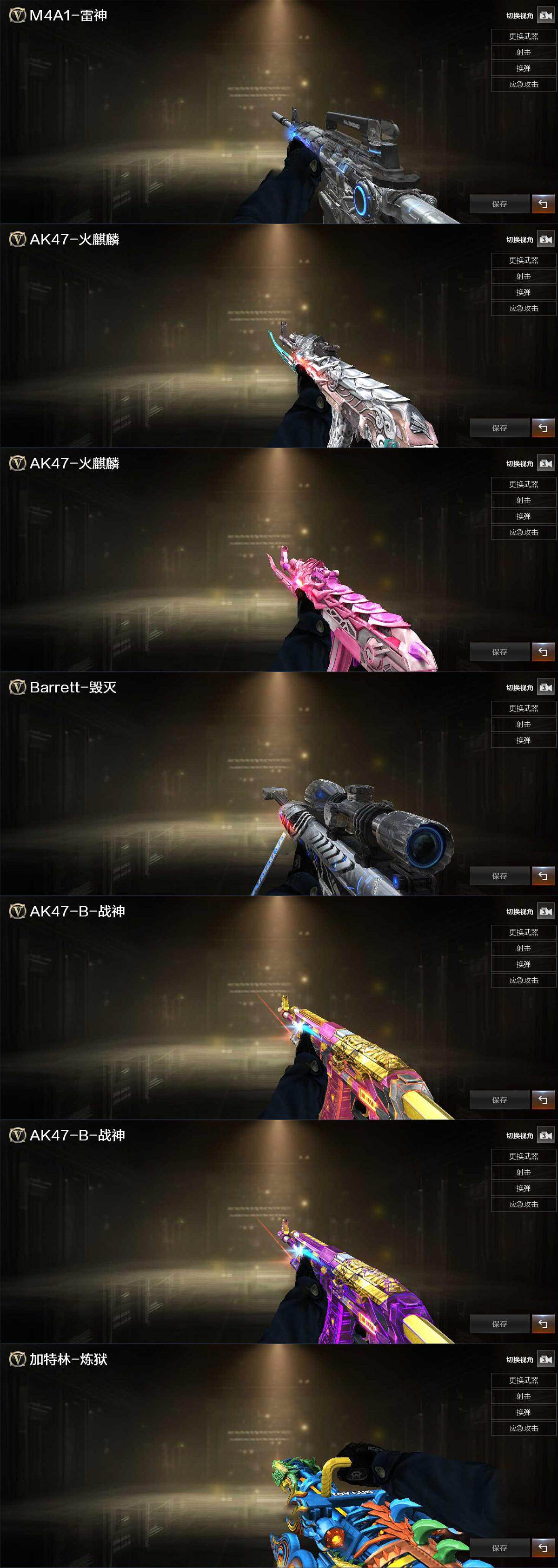 【音效卡】:AK47-火麒麟音效卡,M4A1-雷神音效卡,M4A1-黑骑士音效卡,Barrett-毁灭音效卡