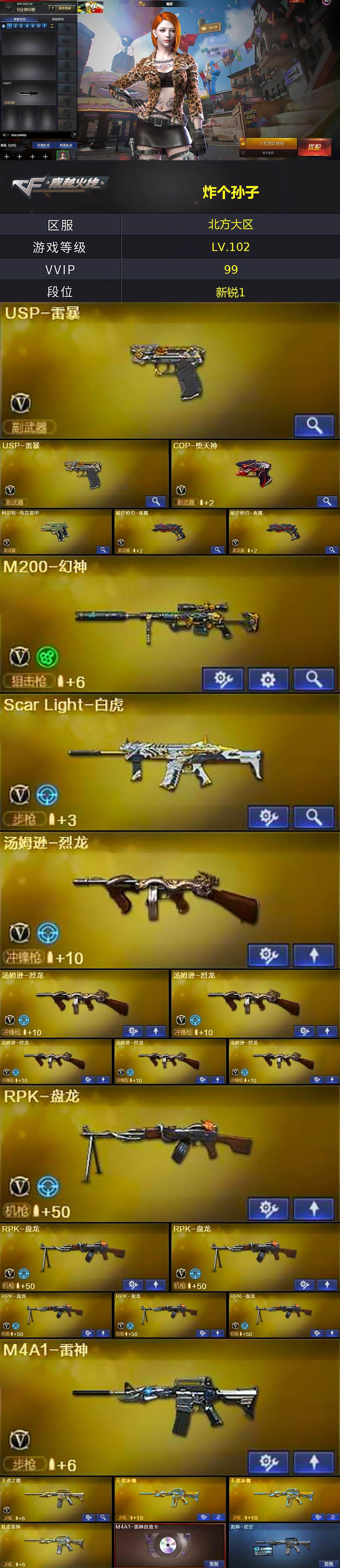 【热门武器】:Scar Light-白虎,HK417-朱雀,M200-幻神,死亡之眼,金色小号,M4A1-黑骑士,汤姆逊-烈龙*6,RPK-盘龙*6,加特林-炼狱,斯泰尔-蝴蝶,火麒麟-绝迹,USP-雷暴*2,COP-堕天神,沙鹰-修罗*2