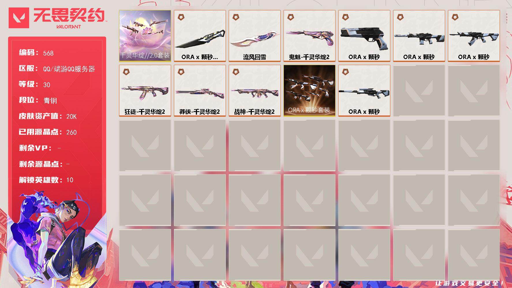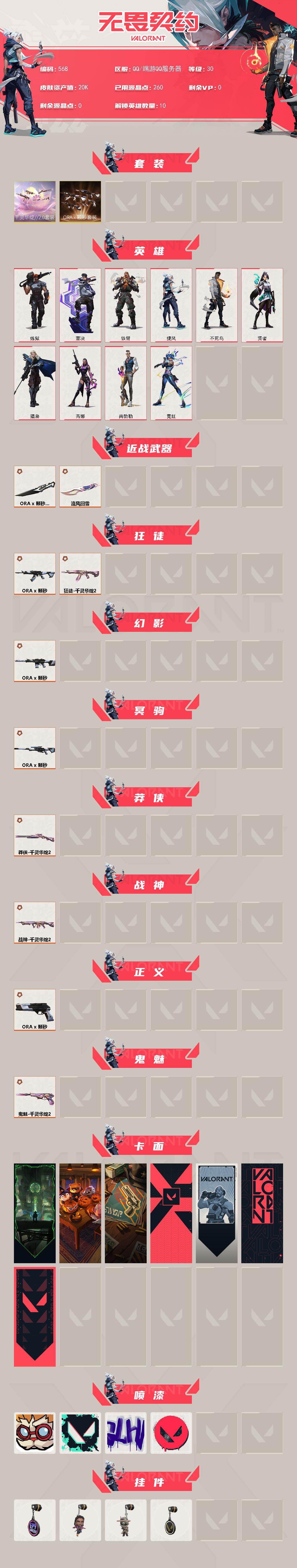 [14932564]【套装】:千灵华绽//2.0套装,ORA x 颗秒套装 【英雄】:炼狱,壹决,铁臂,捷风,不死鸟,贤者,猎枭,芮娜,尚勃勒,霓虹 【近战武器】:近战武器-流风回雪,近战武器-ORA x 颗秒 军刀 【狂徒】:狂徒-ORA x 颗秒,狂徒-千灵华绽//2.0 【幻影】:幻影-ORA x 颗秒 【冥驹】:冥驹-ORA x 颗秒 【莽侠】:莽侠-千灵华绽//2.0 【战神】:战神-千灵华绽//2.0 【正义】:正义-ORA x 颗秒 【鬼魅】:鬼魅-千灵华绽//2.0 【卡面】:欢迎来到底城 卡面,南瓜盛典 卡面,正义的化身 卡面,代号红色 卡面,新兵报到 卡面,V契约 卡面,无畏契约 卡面 【喷漆】:都算到了 喷漆,胜利属于无畏契约 喷漆,GLHF 喷漆,无畏契约 喷漆 【挂饰】:第九季//第三幕 纪念币 挂饰,无畏契约GO!第一卷 芮娜 挂饰,无畏契约GO!第一卷 零 挂饰,无畏契约 纪念币 挂饰