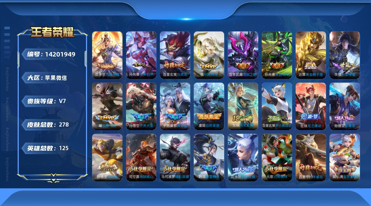 [14201949]金标猴子,苹果WX-V7-278皮肤-1典藏皮肤-10传说-89史诗 【荣耀典藏】:花木兰九霄神辉 【传说皮肤】:干将莫邪画中仙,孙悟空齐天大圣,镜炽阳神光,虞姬启明星使,曜云鹰飞将,李信一念神魔,达摩黄金狮子座,百里玄策白虎志,孙尚香末日机甲,宫本武藏地狱之眼 【限定皮肤】:狄仁杰阴阳师,赵云皇家上将,赵云龙胆,庄周高山流水,高渐离玩趣恶龙,钟无艳超时空战士,白起夜都怪侠,芈月幻夜卜梦,元歌云间偶戏,元歌无心,夏侯惇朔风刀,甄姬游园惊梦,甄姬落雪兰心,马可波罗暗影游猎,狄仁杰魔术师,狄仁杰万华元夜,达摩星际陆战队,达摩沙漠行僧,项羽海滩派对,老夫子醍醐杖,程咬金演武夺筹,韩信逐梦之影,韩信傲雪梅枪,王昭君午后时光,兰陵王金庭之子,花木兰瑞麟志,花木兰默契交锋,亚瑟潮玩骑士王,孙悟空至尊宝,孙悟空孙行者,孙悟空齐天大圣,牛魔御旌,后羿如梦令,李元芳银河之约,李元芳云中旅人,虞姬启明星使,钟馗驱傩正仪,干将莫邪胡桃夹子,干将莫邪画中仙,雅典娜单词大作战,雅典娜黎明之约,蔡文姬繁星吟游,鬼谷子原初探秘者,鬼谷子五谷丰年,黄忠火炮绅士,苏烈千军破阵,百里玄策白虎志,百里玄策原初追逐者,百里守约朱雀志,弈星混沌棋,梦奇顽趣,沈梦溪大漠名商,明世隐疑决卦,明世隐吟游魔法,裴擒虎李小龙,裴擒虎擒涛扼浪,狂铁电玩高手,米莱狄胡桃异想国,云中君纤云弄巧,盾山御銮,猪八戒西部大镖客,上官婉儿梁祝,嫦娥拒霜思,嫦娥暖冬兔眠,蒙犽狂想玩偶喵,鲁班大师探海日志,桑启海盐诗旅,暃星界游侠,艾琳女武神,艾琳流音漫舞,司空震地狱燃心,阿古朵江河有灵,张良古海寻踪,蒙恬荣光圣徽,高渐离燃音魔法,妲己灵卜魔法,鬼谷子天穹祈灯,姬小满妄想食味,刘邦剑破天穹,镜青焰无极,项羽苍威无极 【年限皮肤】:百里玄策白虎志,百里守约朱雀志,花木兰瑞麟志,赵云龙胆 【赛季限定】:夏侯惇朔风刀,狄仁杰万华元夜,达摩沙漠行僧,老夫子醍醐杖,程咬金演武夺筹,兰陵王金庭之子,张良古海寻踪,牛魔御旌,李元芳云中旅人,钟馗驱傩正仪,雅典娜黎明之约,鬼谷子原初探秘者,苏烈千军破阵,百里玄策原初追逐者,弈星混沌棋,梦奇顽趣,沈梦溪大漠名商,明世隐疑决卦,裴擒虎擒涛扼浪,盾山御銮,鲁班大师探海日志,桑启海盐诗旅,鬼谷子天穹祈灯,蒙恬荣光圣徽,刘邦剑破天穹 【战令限定】:钟无艳超时空战士,白起夜都怪侠,芈月幻夜卜梦,元歌云间偶戏,甄