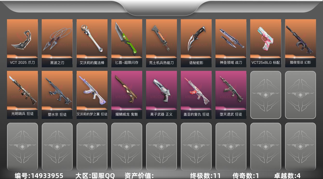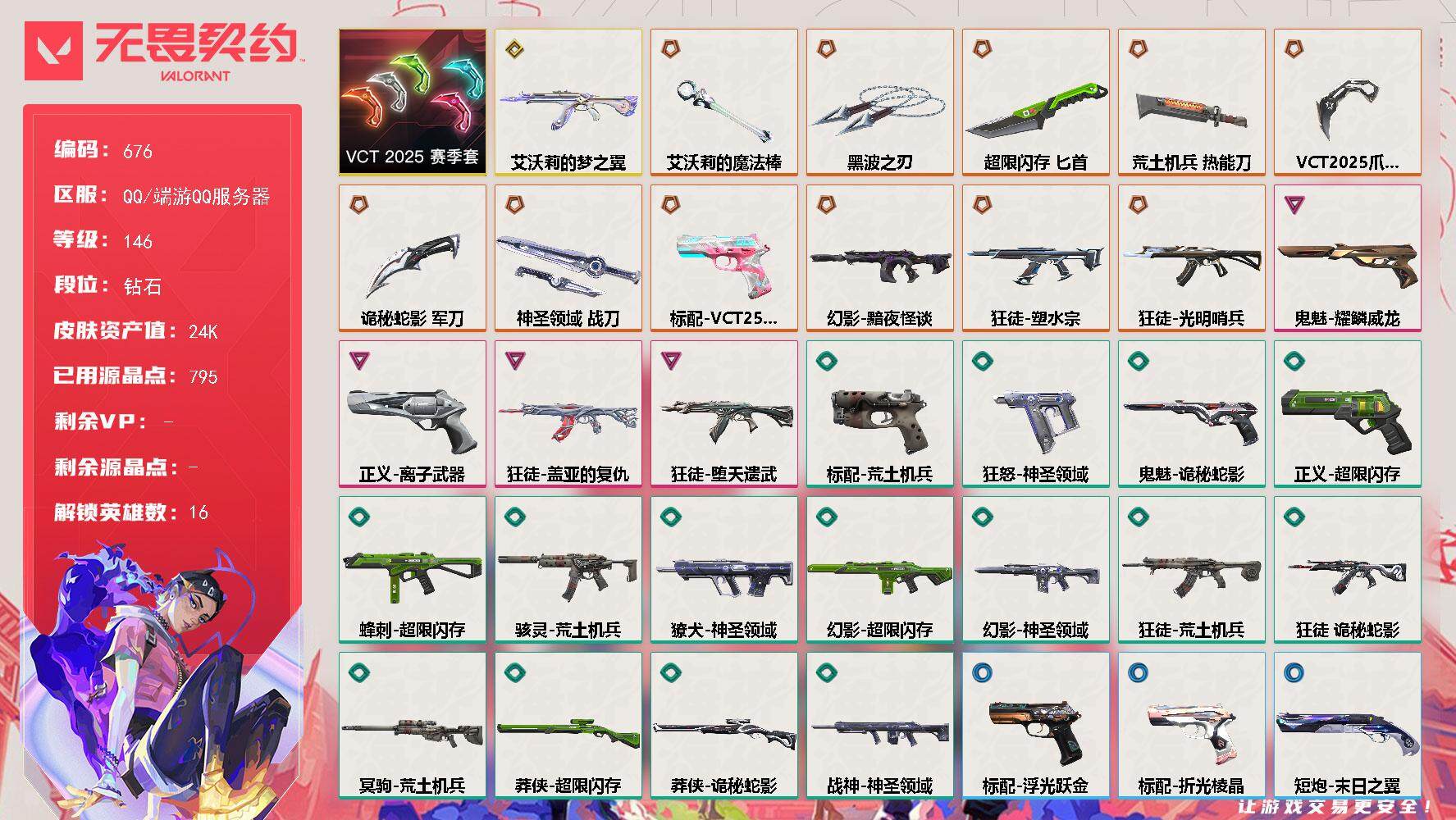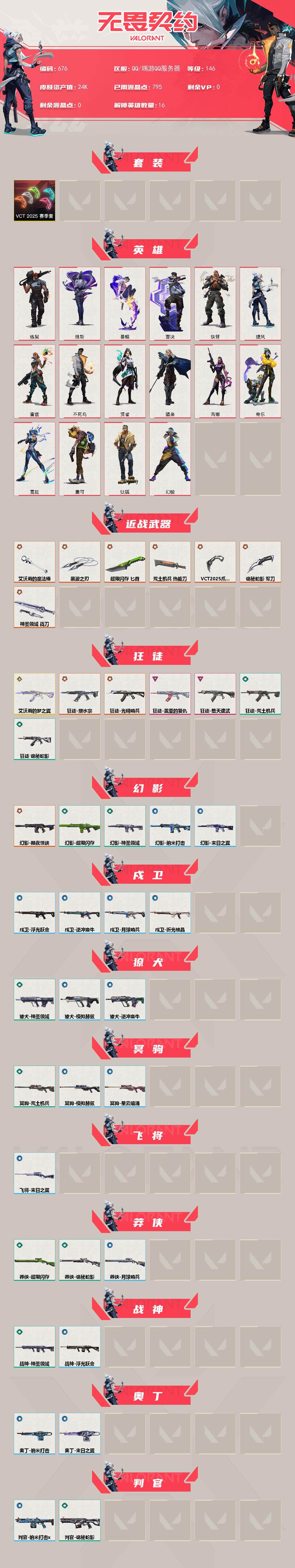[14933955]【套装】:VCT 2025 赛季套装 【英雄】:幻棱,炼狱,维斯,暮蝶,钛狐,壹决,铁臂,捷风,雷兹,不死鸟,贤者,猎枭,芮娜,奇乐,霓虹,盖可 【近战武器】:近战武器-VCT 2025 爪刀,近战武器-黑波之刃,近战武器-艾沃莉的魔法棒,近战武器-超限闪存 匕首,近战武器-荒土机兵 热能刀,近战武器-诡秘蛇影 军刀,近战武器-神圣领域 战刀 【狂徒】:狂徒-艾沃莉的梦之翼,狂徒-光明哨兵,狂徒-塑水宗,狂徒-堕天遗武,狂徒-盖亚的复仇,狂徒-荒土机兵,狂徒-诡秘蛇影 【幻影】:幻影-黯夜怪谈,幻影-超限闪存,幻影-神圣领域,幻影-纳米打击,幻影-末日之翼 【戍卫】:戍卫-浮光跃金,戍卫-逆冲蛮牛,戍卫-月球哨兵,戍卫-折光棱晶 【獠犬】:獠犬-神圣领域,獠犬-模拟赫兹,獠犬-逆冲蛮牛 【冥驹】:冥驹-荒土机兵,冥驹-模拟赫兹,冥驹-星云暗涌 【飞将】:飞将-末日之翼 【莽侠】:莽侠-超限闪存,莽侠-诡秘蛇影,莽侠-月球哨兵 【战神】:战神-神圣领域,战神-浮光跃金 【奥丁】:奥丁-纳米打击,奥丁-末日之翼 【判官】:判官-诡秘蛇影,判官-纳米打击x 【雄鹿】:雄鹿-模拟赫兹,雄鹿-逆冲蛮牛,雄鹿-月球哨兵 【骇灵】:骇灵-荒土机兵,骇灵-浮光跃金,骇灵-星云暗涌 【蜂刺】:蜂刺-超限闪存,蜂刺-星云暗涌,蜂刺-折光棱晶 【标配】:标配-荒土机兵,标配-浮光跃金,标配-折光棱晶 【VCT手枪】:标配-VCT25 x BLG 【正义】:正义-离子武器,正义-超限闪存,正义-纳米打击,正义-月球哨兵 【鬼魅】:鬼魅-耀鳞威龙,鬼魅-诡秘蛇影,鬼魅-模拟赫兹,鬼魅-星云暗涌 【狂怒】:狂怒-神圣领域,狂怒-逆冲蛮牛 【短炮】:短炮-末日之翼 【卡面】:终章:激斗汉堡 卡面,进入射程 卡面,分崩离析 卡面,纳米打击 卡面,抑制技术 卡面,激斗汉堡 卡面,瓦娃脸雪糕 P2 卡面,从黄昏到黎明 卡面,荒土机兵 卡面,银弹猎手 卡面,逆冲蛮牛 卡面,《双城之战》拥抱 卡面,精灵大战 卡面,欢迎来到底城 卡面,南瓜盛典 卡面,VCT CN首冠 卡面,唱片的故事 卡面,钢弓与箭弦 卡面,无畏契约:暮蝶 卡面,排除故障 卡面,战术桌游 卡面,悠享食光 卡面,修车达人 卡面,热舞环节 卡面,模拟赫兹 卡面,浮光跃金 卡面,超限闪存 卡面,维斯工牌 卡面,正义的化身 卡面,无畏契约GO!