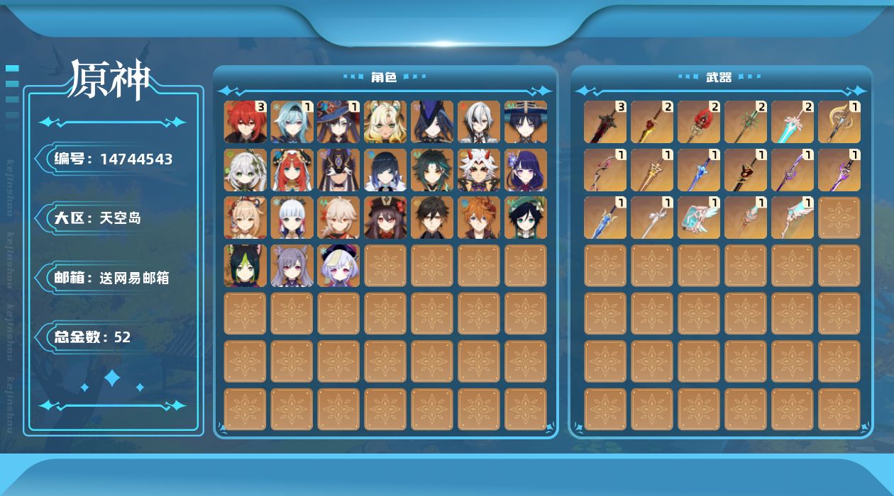 0命克洛琳德,0命阿蕾奇诺,0命流浪者,0命纳西妲,0命妮露,0命赛诺,0命提纳里,0命夜兰,0命荒泷一斗,1命优菈,0命雷电将军,0命枫原万叶,0命神里绫华,0命钟离,0命胡桃,0命魈,0命宵宫,0命温迪,0命达达利亚,0命刻晴,0命七七,1命莫娜,3命迪卢克,0命希诺宁,精2有乐御簾切,精1裁断,精1最初的大魔术,精1圣显之钥,精1波乱月白经津,精1赤角石溃杵,精1薙草之稻光,精1雾切之回光,精1松籁响起之时,精2护摩之杖,精2和璞鸢,精1天空之脊,精1天空之翼,精1天空之卷,精1风鹰剑,精3狼的末路,精2天空之傲