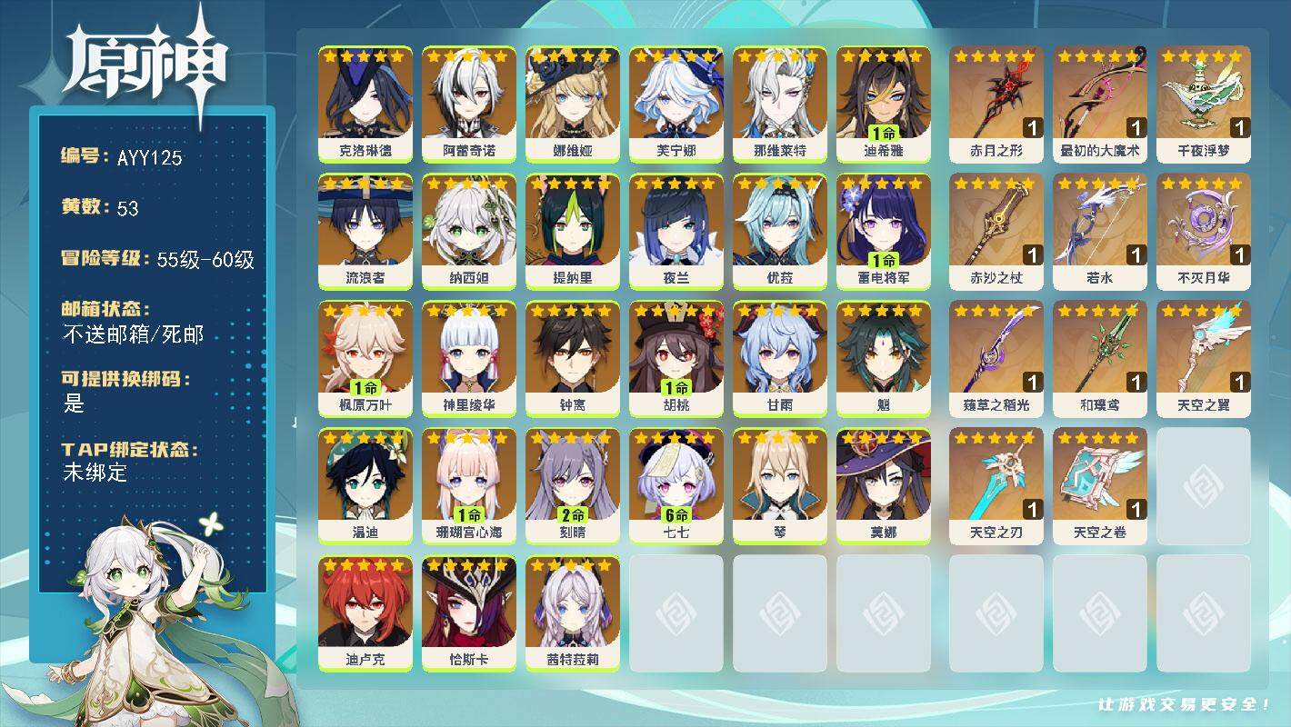 [14877967]60级/53黄/男主/27个五星角色/13个五星武器 0命克洛琳德,0命阿蕾奇诺,0命娜维娅,0命芙宁娜,0命那维莱特,1命迪希雅,0命流浪者,0命纳西妲,0命提纳里,0命夜兰,0命优菈,1命雷电将军,1命枫原万叶,0命神里绫华,0命钟离,1命胡桃,0命甘雨,0命魈,0命温迪,1命珊瑚宫心海,2命刻晴,满命七七,0命琴,0命莫娜,0命迪卢克,0命恰斯卡,0命茜特菈莉,精1赤月之形,精1最初的大魔术,精1千夜浮梦,精1赤沙之杖,精1若水,精1不灭月华,精1薙草之稻光,精1和璞鸢,精1天空之翼,精1天空之刃,精1天空之卷