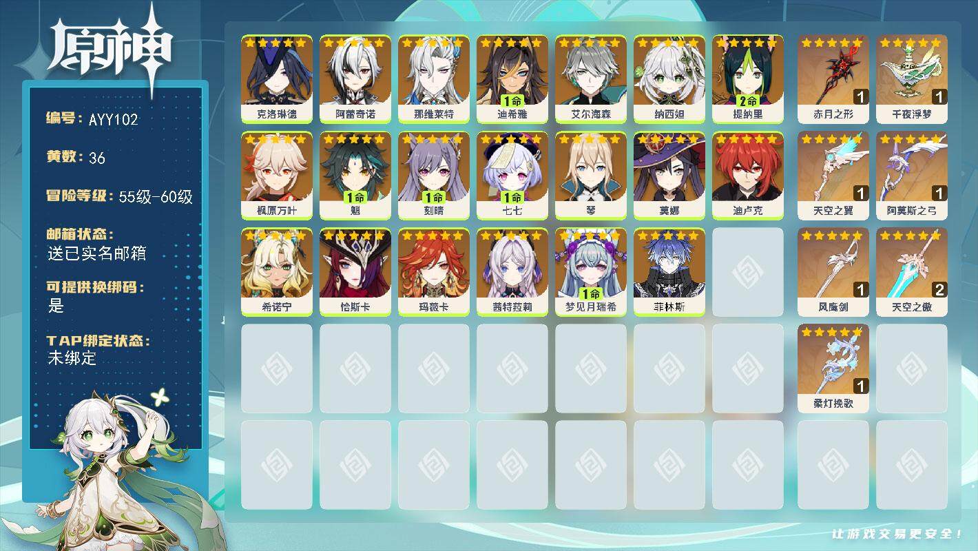 [14835498]60级/36黄/女主/20个五星角色/8个五星武器 0命克洛琳德,0命阿蕾奇诺,0命那维莱特,1命迪希雅,0命艾尔海森,0命纳西妲,2命提纳里,0命枫原万叶,1命魈,1命刻晴,1命七七,0命琴,0命莫娜,0命迪卢克,0命希诺宁,0命恰斯卡,0命玛薇卡,0命茜特菈莉,1命梦见月瑞希,0命菲林斯,精1赤月之形,精1千夜浮梦,精1天空之翼,精1阿莫斯之弓,精1风鹰剑,精2天空之傲,精1柔灯挽歌