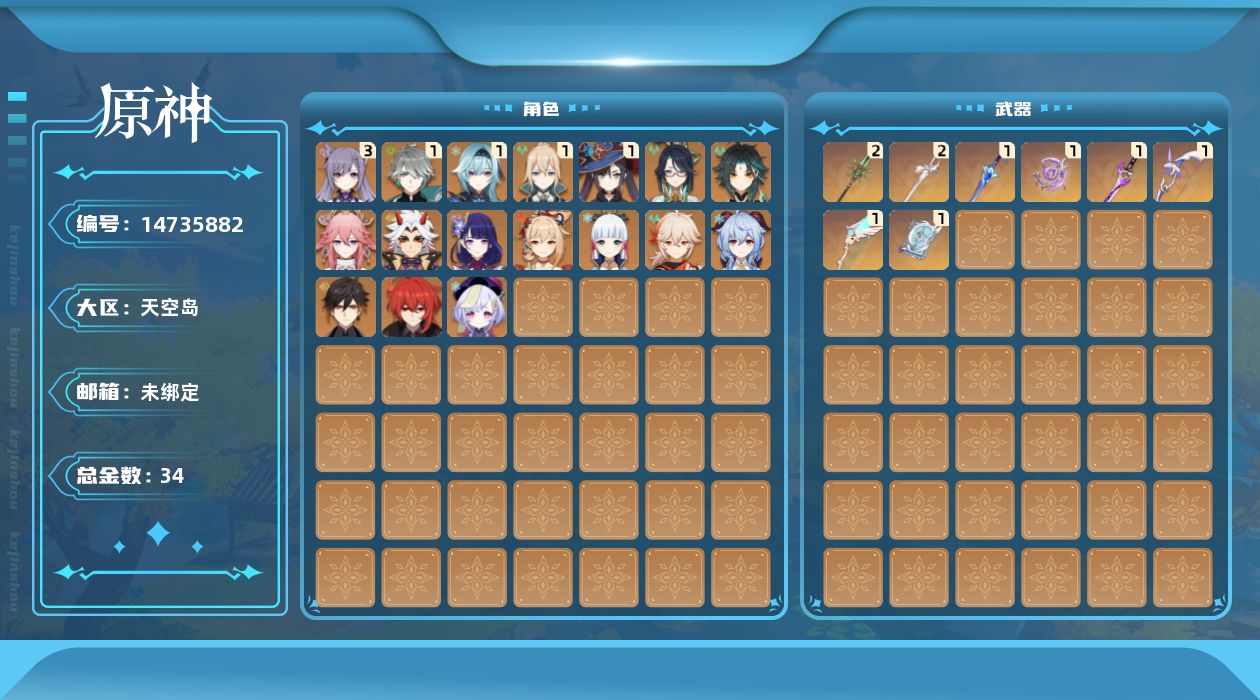 0命闲云,1命艾尔海森,0命八重神子,0命荒泷一斗,1命优菈,0命雷电将军,0命枫原万叶,0命神里绫华,0命钟离,0命甘雨,0命魈,0命宵宫,3命刻晴,0命七七,1命琴,1命莫娜,0命迪卢克,精1波乱月白经津,精1不灭月华,精1雾切之回光,精1四风原典,精2和璞鸢,精1天空之翼,精1阿莫斯之弓,精2风鹰剑