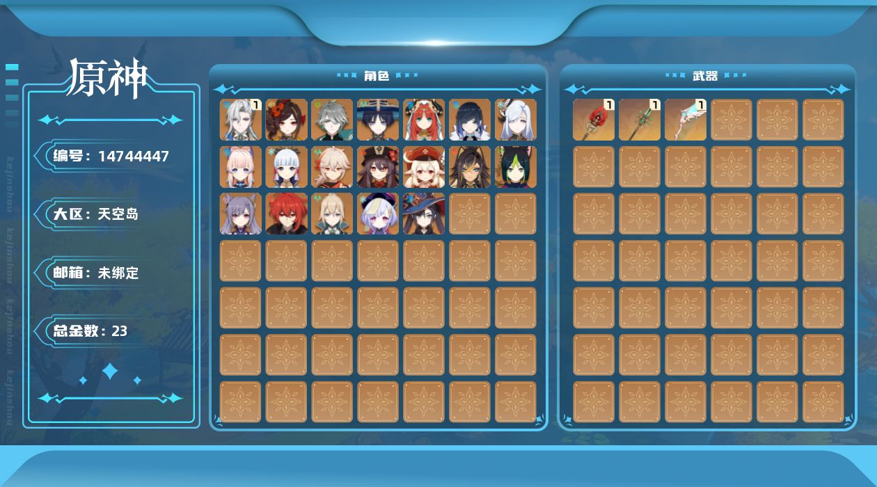 0命千织,1命那维莱特,0命迪希雅,0命艾尔海森,0命流浪者,0命妮露,0命提纳里,0命夜兰,0命申鹤,0命枫原万叶,0命神里绫华,0命胡桃,0命可莉,0命珊瑚宫心海,0命刻晴,0命七七,0命琴,0命莫娜,0命迪卢克,精1护摩之杖,精1和璞鸢,精1天空之翼