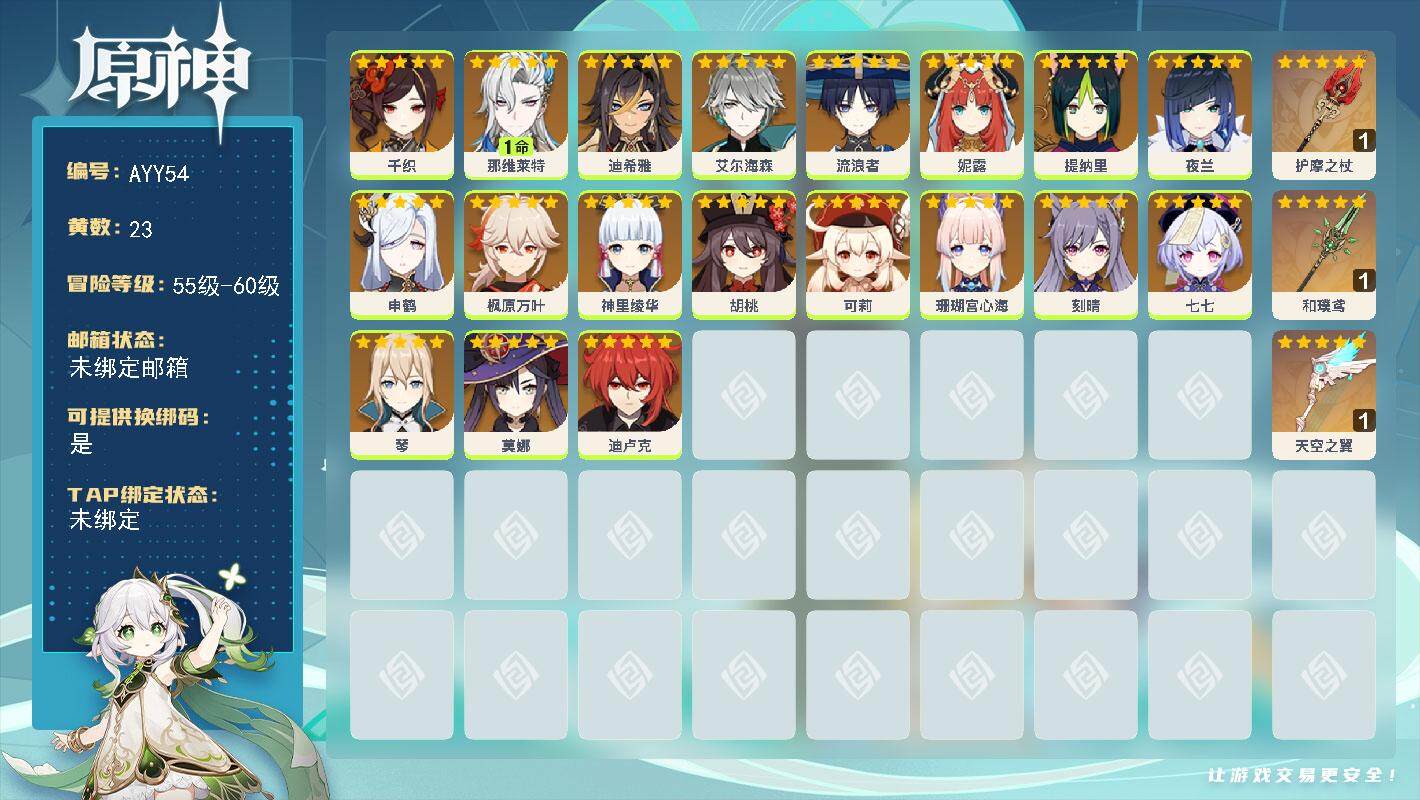 [14744447]56级/23黄/女主/19个五星角色/3个五星武器 0命千织,1命那维莱特,0命迪希雅,0命艾尔海森,0命流浪者,0命妮露,0命提纳里,0命夜兰,0命申鹤,0命枫原万叶,0命神里绫华,0命胡桃,0命可莉,0命珊瑚宫心海,0命刻晴,0命七七,0命琴,0命莫娜,0命迪卢克,精1护摩之杖,精1和璞鸢,精1天空之翼