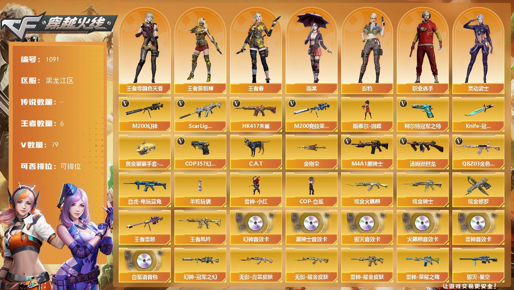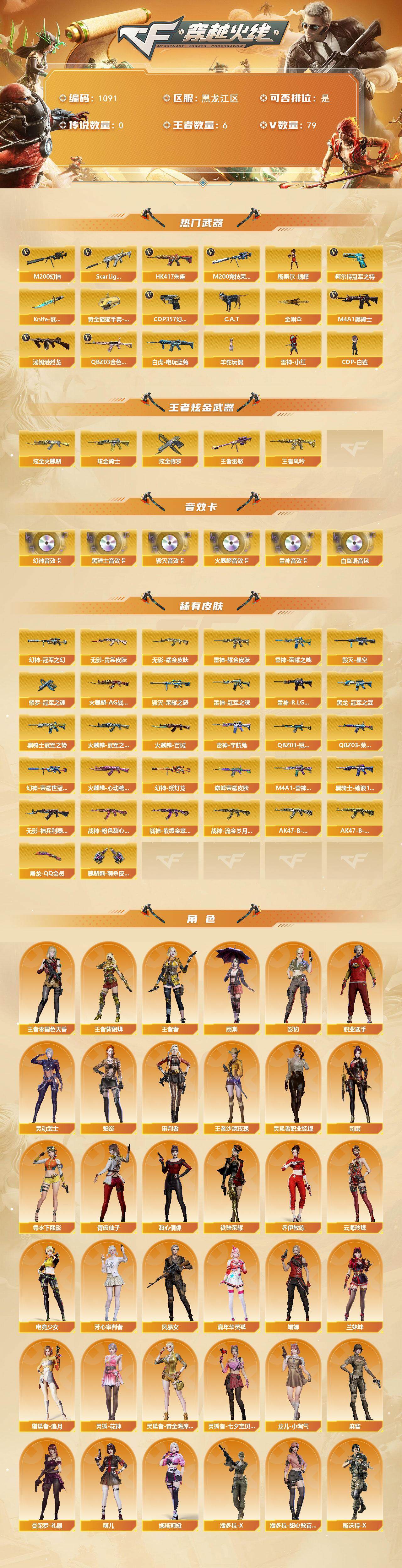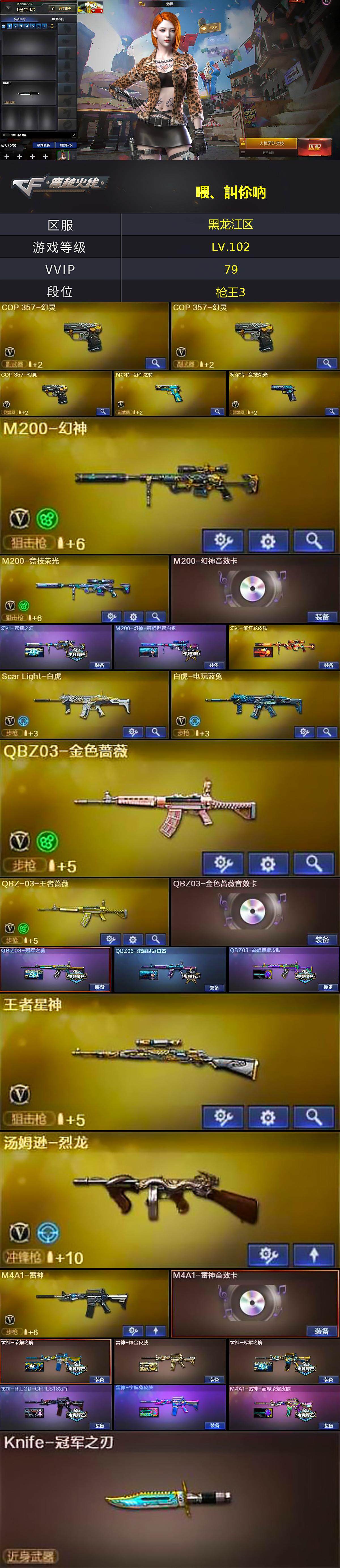 [14935224]黑龙江区-79V-6王者-3炫金 【热门武器】:QBZ03-金色蔷薇,Scar Light-白虎,HK417-朱雀,M200-幻神,M200-竞技荣光,白虎-电玩蓝兔,柯尔特-冠军之特,C.A.T,M4A1-黑骑士,汤姆逊-烈龙,斯泰尔-蝴蝶,羊驼玩偶,雷神-小红,COP-白鲨,COP 357-幻灵*3,Knife-冠军之刃,黄金猫猫手套-白鲨,金刚伞 【王者炫金武器】:王者凤吟,王者雷怒,炫金火麒麟,炫金骑士,炫金修罗 【音效卡】:M200-幻神音效卡,AK47-火麒麟音效卡,M4A1-雷神音效卡,M4A1-黑骑士音效卡,Barrett-毁灭音效卡,白鲨语音包 【皮肤】:幻神-冠军之幻,M200-幻神-荣耀世冠白鲨,幻神-纸灯龙皮肤,QBZ03-冠军之薇,QBZ03-荣耀世冠白鲨,QBZ03-巅峰荣耀皮肤,雷神-荣耀之魄,雷神-耀金皮肤,雷神-冠军之魄,雷神-R.LGD-CFPLS18冠军,雷神-宇航兔皮肤,M4A1-雷神-巅峰荣耀皮肤,火麒麟-AG战队皮肤,火麒麟-冠军之心,火麒麟-百城,火麒麟-心动糖果,毁灭-荣耀之怒,毁灭-星空,黑龙-冠军之武,黑骑士-冠军之势,黑骑士-破浪10年皮肤,无影耀金皮肤,无影-霓裳皮肤,无影-神兵利器 皮肤,战神-粉色甜心皮肤,战神-紫绶金章皮肤*2,战神-流金岁月皮肤,AK47-B-常胜将军-刘备*2,AK47-B-常胜将军-孙权*2,修罗-冠军之魂,屠龙-QQ会员,麒麟刺-萌杀皮肤 【角色】:魅影,雨棠,影豹,司雨,审判者,王者-零-国色天香,王者-葵-貂蝉,王者春,王者沙漠玫瑰,乔伊教练,云海玲珑,电竞少女,芳心审判者,风暴女,嘉年华灵狐,娟娟,兰妹妹,猎狐者-追月,灵动武士,零-水下丽影,灵狐-花神,灵狐者-黄金海岸,灵狐者-七夕宝贝,灵狐者-职业经理,龙儿-小淘气,麻雀,曼陀罗-礼服,萌儿,娜塔莉娅,潘多拉-X,潘多拉-甜心教官,青霞仙子,斯沃特-X,甜心偶像,铁骑荣耀,兔囡囡,雪莉杨-摸金校尉,夜玫瑰-幻能朋克,樱-战斗天使,职业选手 【人偶武器】:雷神-小红,COP-白鲨,雷神-枪娘蕾安娜,迷你宝贝,斯泰尔-蝴蝶,巴雷特-零-水下丽影,斯泰尔-枪娘暗刃,AWM-灵狐-15周年嘉年华,COP-旗袍,C.A.T,闪光弹-小乔,闪光弹-貂蝉,高爆手雷-大乔,迷你超能女侍,灵狐娃娃手雷 【暴走生化】:超级对讲机 【挑战大