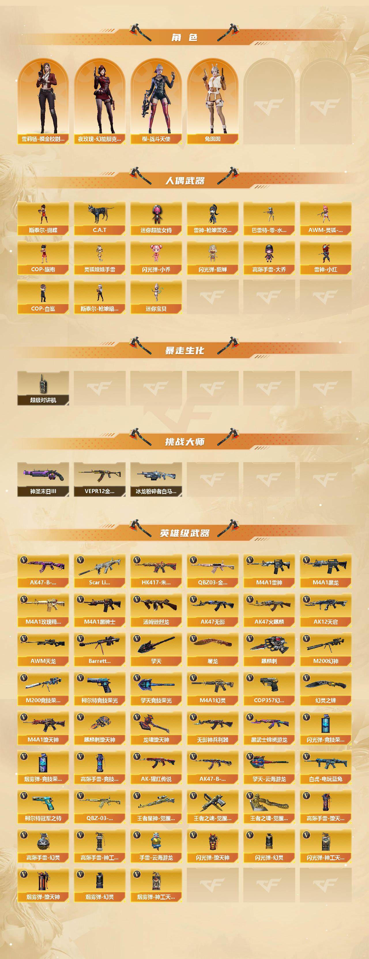 【热门武器】:QBZ03-金色蔷薇,Scar Light-白虎,HK417-朱雀,M200-幻神,M200-竞技荣光,白虎-电玩蓝兔,柯尔特-冠军之特,C.A.T,M4A1-黑骑士,汤姆逊-烈龙,斯泰尔-蝴蝶,羊驼玩偶,雷神-小红,COP-白鲨,COP 357-幻灵*3,Knife-冠军之刃,黄金猫猫手套-白鲨,金刚伞