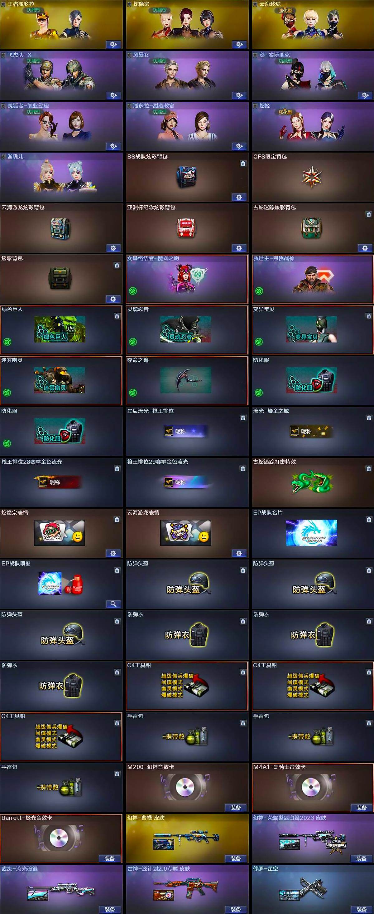 【道具】:BS战队炫彩背包,CFS限定背包,云海游龙炫彩背包,亚洲杯纪念炫彩背包,古蛇迷踪炫彩背包,炫彩背包,女皇终结者-魔龙之吻,救世主-黑桃战神,绿色巨人,灵魂忍者,变异宝贝,迷雾幽灵,夺命之镰,防化服*2,星辰流光-枪王排位,流光-鎏金之域,枪王排位28赛季金色流光,枪王排位29赛季金色流光,古蛇迷踪打击特效,蛇隐宗表情,云海游龙表情,EP战队名片,EP战队喷图,防弹头盔*3,防弹衣*3,C4工具钳*3,手雷包*3