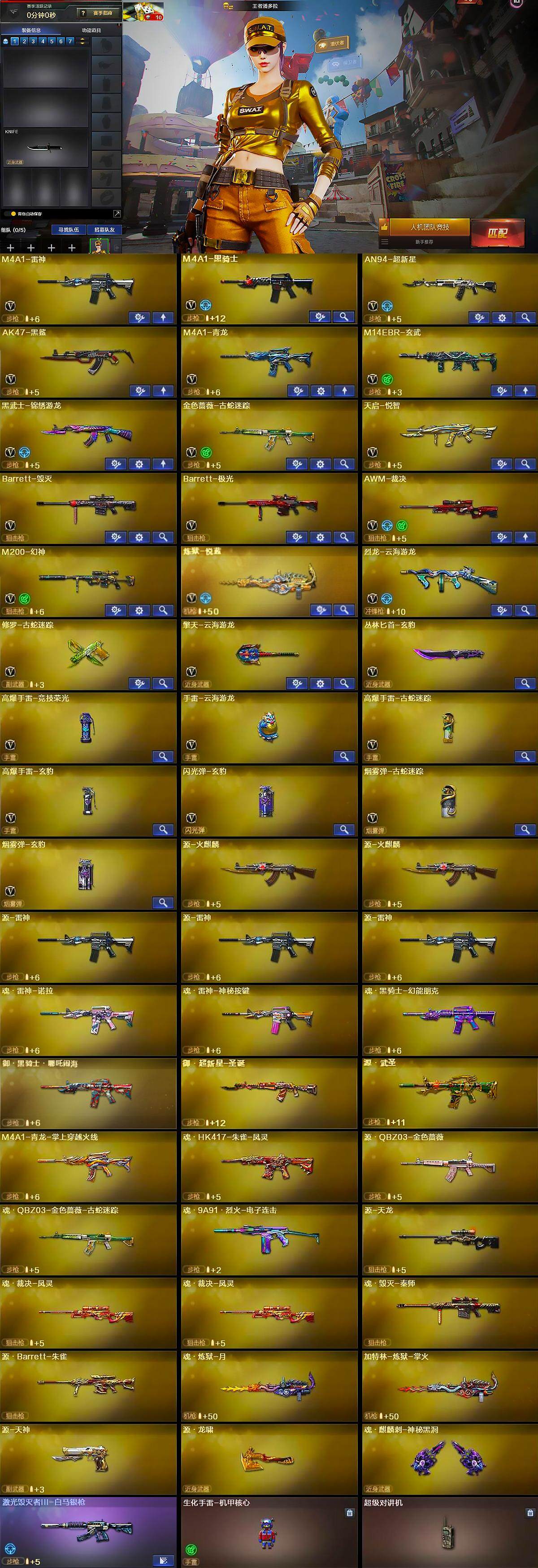 【英雄级武器】:M4A1-雷神,M4A1-黑骑士,AN94-超新星,AK47-黑鲨,M4A1-青龙,M14EBR-玄武,黑武士-锦绣游龙,金色蔷薇-古蛇迷踪,天启-悦智-觉醒版,Barrett-毁灭,Barrett-极光,AWM-裁决,M200-幻神,炼狱-悦蓝-觉醒版,烈龙-云海游龙,修罗-古蛇迷踪,擎天-云海游龙,丛林匕首-玄豹,高爆手雷-竞技荣光,手雷-云海游龙,高爆手雷-古蛇迷踪,高爆手雷-玄豹,闪光弹-玄豹,烟雾弹-古蛇迷踪,烟雾弹-玄豹