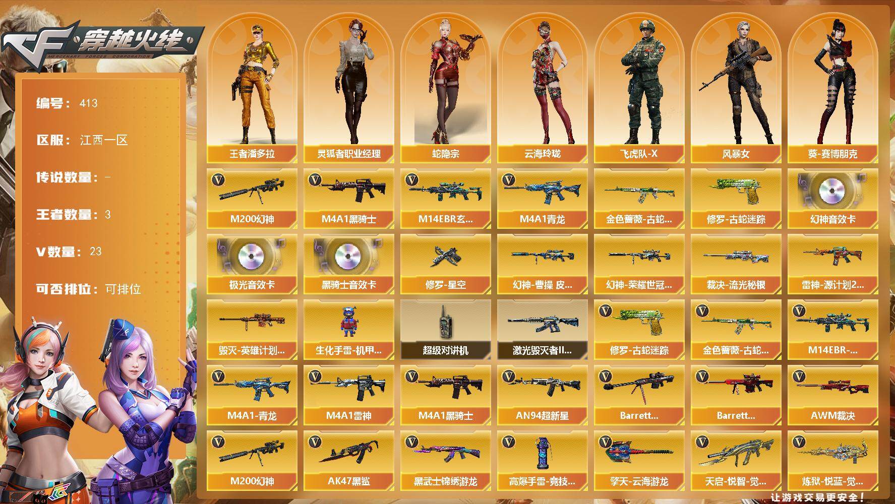 [14608417]江西一区-23V-3王者-0炫金 【热门武器】:M14EBR-玄武,M4A1-青龙,M200-幻神,金色蔷薇-古蛇迷踪,修罗-古蛇迷踪,M4A1-黑骑士 【音效卡】:M200-幻神音效卡,M4A1-黑骑士音效卡,Barrett-极光音效卡 【皮肤】:幻神-荣耀世冠白鲨2023 皮肤,幻神-曹操 皮肤,裁决-流光秘银,雷神-源计划2.0专属 皮肤,毁灭-英雄计划 皮肤,修罗-星空 【角色】:王者潘多拉,蛇隐宗,云海玲珑,飞虎队-X,风暴女,葵-赛博朋克,兰-梨园特工,灵狐者-职业经理,潘多拉-甜心教官,蛇姬,游珑儿 【人偶武器】:生化手雷-机甲核心 【暴走生化】:超级对讲机 【挑战大师】:激光毁灭者III-白马银枪 【英雄级武器】:M4A1-雷神,M4A1-黑骑士,AN94-超新星,AK47-黑鲨,M4A1-青龙,M14EBR-玄武,黑武士-锦绣游龙,金色蔷薇-古蛇迷踪,天启-悦智-觉醒版,Barrett-毁灭,Barrett-极光,AWM-裁决,M200-幻神,炼狱-悦蓝-觉醒版,烈龙-云海游龙,修罗-古蛇迷踪,擎天-云海游龙,丛林匕首-玄豹,高爆手雷-竞技荣光,手雷-云海游龙,高爆手雷-古蛇迷踪,高爆手雷-玄豹,闪光弹-玄豹,烟雾弹-古蛇迷踪,烟雾弹-玄豹 【道具】:BS战队炫彩背包,CFS限定背包,云海游龙炫彩背包,亚洲杯纪念炫彩背包,古蛇迷踪炫彩背包,炫彩背包,女皇终结者-魔龙之吻,救世主-黑桃战神,绿色巨人,灵魂忍者,变异宝贝,迷雾幽灵,夺命之镰,防化服*2,星辰流光-枪王排位,流光-鎏金之域,枪王排位28赛季金色流光,枪王排位29赛季金色流光,古蛇迷踪打击特效,蛇隐宗表情,云海游龙表情,EP战队名片,EP战队喷图,防弹头盔*3,防弹衣*3,C4工具钳*3,手雷包*3 【特殊枪械】:1黑骑士