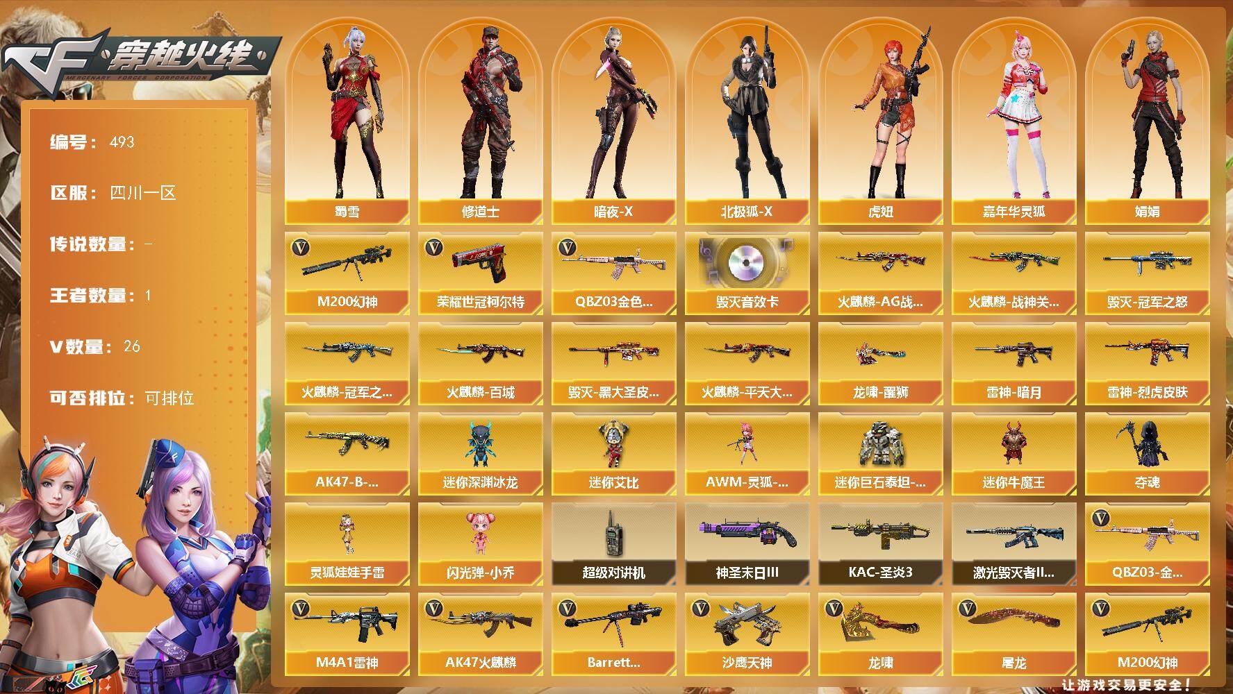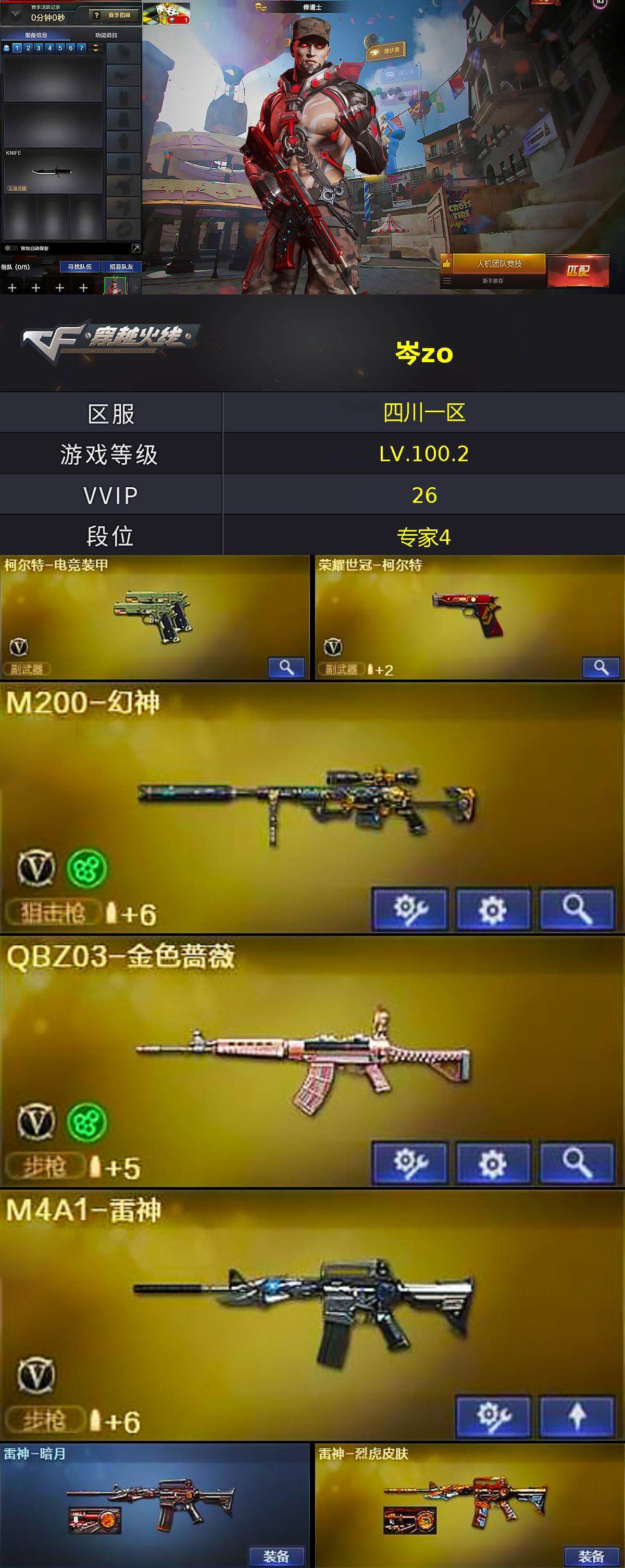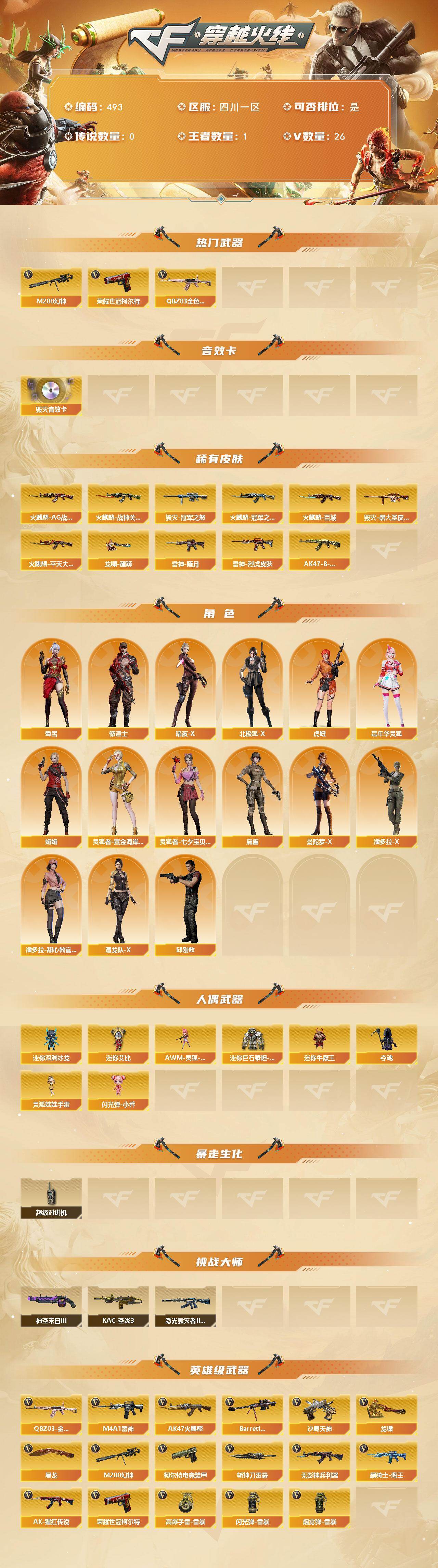 [14731660]四川一区-26V-1王者-0炫金 【热门武器】:QBZ03-金色蔷薇,M200-幻神,荣耀世冠-柯尔特 【音效卡】:Barrett-毁灭音效卡 【皮肤】:雷神-暗月,雷神-烈虎皮肤,火麒麟-AG战队皮肤,火麒麟-冠军之心,火麒麟-战神关羽,火麒麟-平天大圣,火麒麟-百城,毁灭-冠军之怒,毁灭-黑大圣皮肤,AK47-B-常胜将军-孙权,龙啸-醒狮 皮肤 【角色】:修道士,暗夜-X,北极狐-X,虎妞,嘉年华灵狐,娟娟,灵狐者-黄金海岸,灵狐者-七夕宝贝,麻雀,曼陀罗-X,潘多拉-X,潘多拉-甜心教官,潜龙队-X,邱刚敖,蜀雪 【人偶武器】:AWM-灵狐-15周年嘉年华,迷你深渊冰龙,迷你牛魔王,夺魂,闪光弹-小乔,迷你艾比,迷你巨石泰坦-魔花研究所,灵狐娃娃手雷*2 【暴走生化】:超级对讲机 【挑战大师】:激光毁灭者III-白马银枪,KAC-圣炎切割者III,神圣爆裂者-末日III 【英雄级武器】:AK47-火麒麟,M4A1-雷神,无影-神兵利器,QBZ03-金色蔷薇,AK-47-猩红传说,黑骑士-海王*2,Barrett-毁灭,M200-幻神,沙鹰-天神,柯尔特-电竞装甲,荣耀世冠-柯尔特,屠龙,龙啸*2,斩神刀-雷暴,高爆手雷-雷暴,闪光弹-雷暴,烟雾弹-雷暴 【道具】:XROCK炫彩背包,超级背包,夺命之镰,防化服,金色流光-枪王排位*2,星辰流光-枪王排位,防弹头盔*3,防弹衣*3,C4工具钳,手雷包 【特殊枪械】: