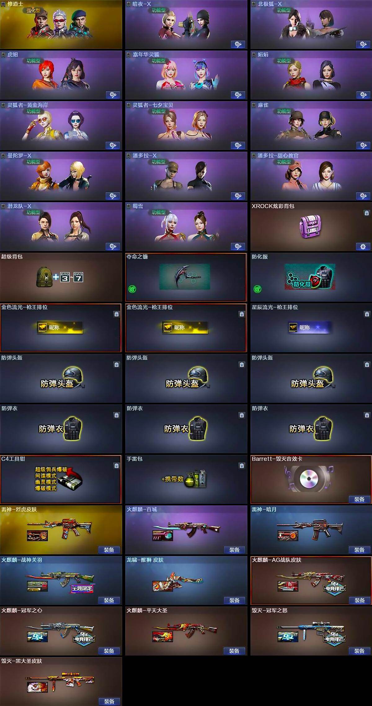 【道具】:XROCK炫彩背包,超级背包,夺命之镰,防化服,金色流光-枪王排位*2,星辰流光-枪王排位,防弹头盔*3,防弹衣*3,C4工具钳,手雷包
