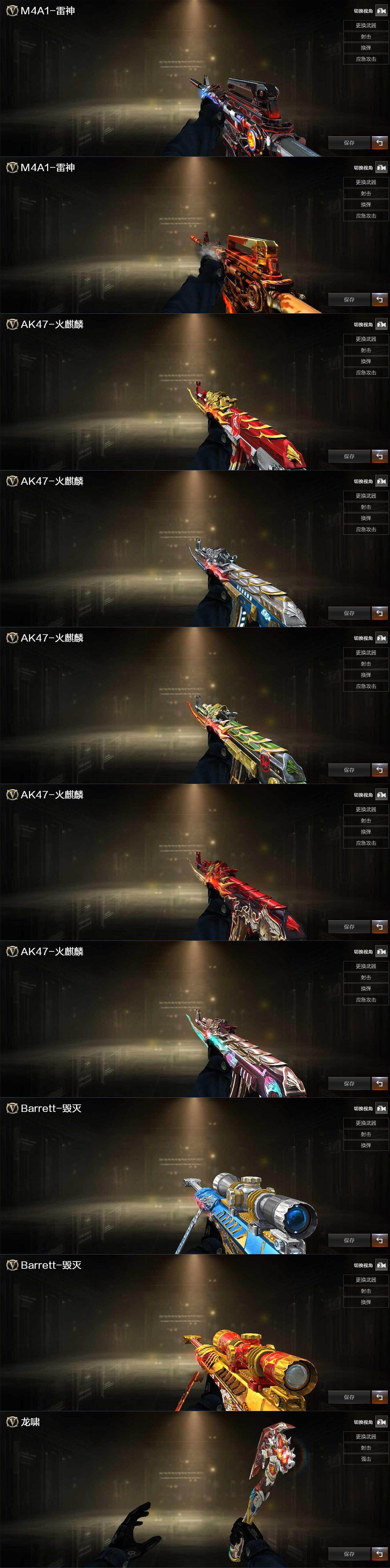 【英雄级武器】:AK47-火麒麟,M4A1-雷神,无影-神兵利器,QBZ03-金色蔷薇,AK-47-猩红传说,黑骑士-海王*2,Barrett-毁灭,M200-幻神,沙鹰-天神,柯尔特-电竞装甲,荣耀世冠-柯尔特,屠龙,龙啸*2,斩神刀-雷暴,高爆手雷-雷暴,闪光弹-雷暴,烟雾弹-雷暴