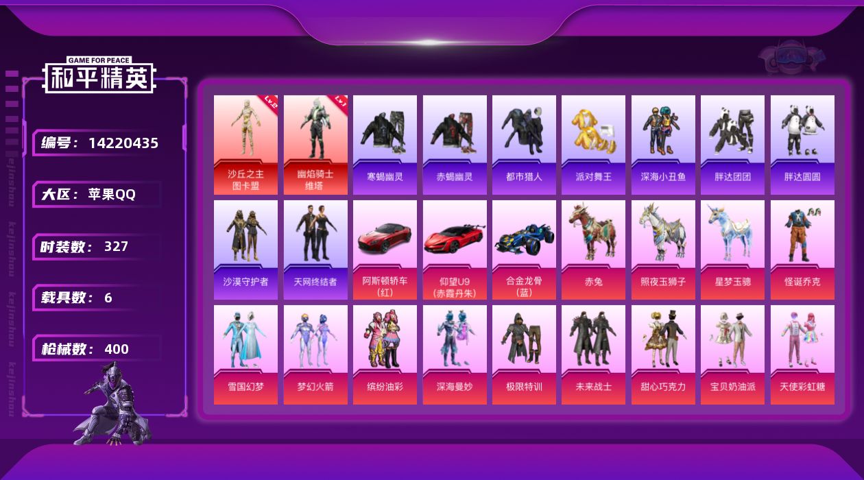 [14220435]苹果 手Q-2神装-24粉装-17特效枪-6载具-5粉色飞行器-146466热力值-24王牌印记-327套装-400枪皮