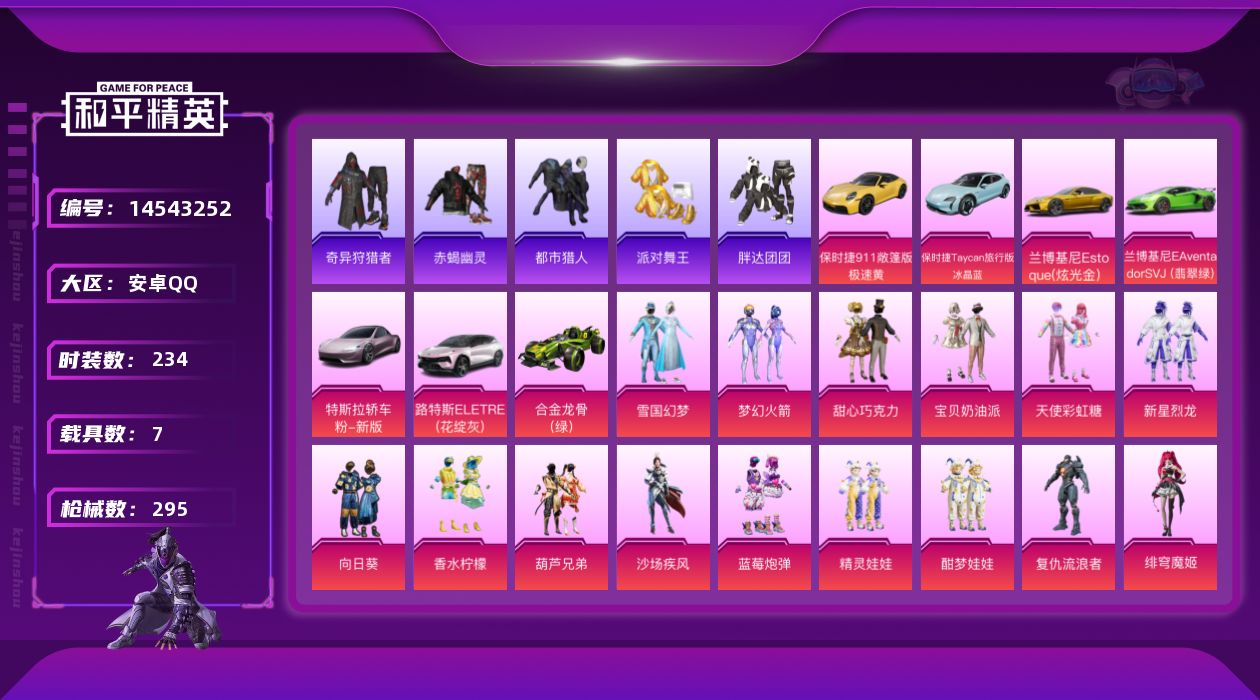 [14543252]安卓 手Q-15粉装-12特效枪-7载具-2粉色飞行器-112764热力值-20王牌印记-234套装-295枪皮 【热门品类】:粉装-雪国幻梦,粉装-梦幻火箭,套装-浪漫天命,套装-赤蝎幽灵,套装-都市猎人,套装-派对舞王,套装-小丑鱼,套装-奇异狩猎者,套装-胖达团团,套装-忍者信条,套装-龟仙人,套装-暗影哥特,套装-粉红小猪 【粉色载具】:特斯拉Roadster(沁心粉),兰博基尼Aventador SVJ(翡翠绿),兰博基尼Estoque(炫光金),路特斯ELETRE(花绽灰),保时捷911 敞篷版(极速黄),保时捷Taycan 旅行版(冰晶蓝),合金龙骨(绿) 【粉色套装】:粉装-甜心巧克力,粉装-宝贝奶油派,粉装-天使彩虹糖,粉装-雪国幻梦,粉装-梦幻火箭,粉装-新星烈龙,粉装-向日葵,粉装-香水柠檬,粉装-葫芦兄弟,粉装-沙场疾风,粉装-蓝莓炮弹,粉装-精灵娃娃,粉装-酣梦娃娃,角色-复仇流浪者,角色-绯穹魔姬 【粉色枪皮等级】:AKM-甜心宝贝(五级),AKM-炫紫旋律(一级),SCAR-L-梦幻火箭(六级),SCAR-L-青春物语(一级),M416-心之恋语(五级),AUG-星之彼岸(六级),M762-甜蜜誓约(六级),M762-甜心娃娃(一级),UMP45-相思残雪(七级),Kar98K-巳巳如意(五级),Mk14-甜梦熊击(五级),DP-28-豹影疾电(五级) 【粉色枪皮】:AKM-甜心宝贝,AKM-炫紫旋律,SCAR-L-梦幻火箭,SCAR-L-青春物语,M416-心之恋语,AUG-星之彼岸,M762-甜蜜誓约,M762-甜心娃娃,UMP45-相思残雪,Kar98K-巳巳如意,Mk14-甜梦熊击,DP-28-豹影疾电 【粉色飞行器】:激战未来飞行器,天之羽翼飞行器 【粉色降落伞】:深海曼妙降落伞,幻影战神降落伞,甜心宝贝降落伞,梦幻火箭降落伞,炫紫旋律降落伞,PEL轰鸣竞梦者降落伞,神秘黑猫降落伞,繁花小夜曲降落伞,甜蜜誓约降落伞,荧光虫舞降落伞,相思残雪降落伞,蓝莓炮弹降落伞,甜心娃娃降落伞,焦糖拿铁降落伞,筑梦精灵降落伞,垂柳戏鸭降落伞,千金淑猫降落伞,樱桃泡泡降落伞,喜羊羊与灰太狼降落伞,极意拳锋降落伞 【稀有套装】:套装-龟仙人,套装-巳巳如意,角色-光矢逐梦,套装-彩虹兔,套装-云朵鹅,套装-雪绒豹,角色-灵公主,套装-朱霞炽焰,