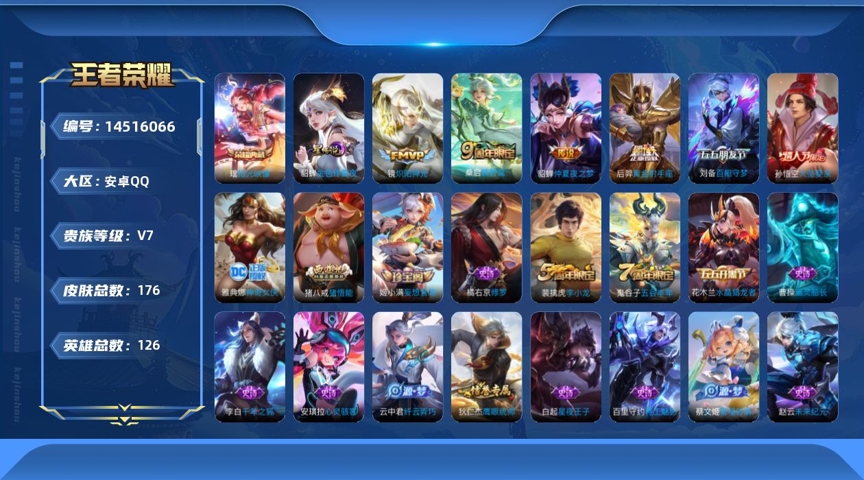 - [11498179]V7 1典藏 6传说 123英雄 240皮肤 可修改实名 女号 荣耀水晶:幻阙歌(貂蝉典藏) 传说皮:遇见胡旋,末日机甲-孙尚香(绿蚂蚱),云霓雀翎,久胜战神,澜逐花归海 珍宝阁皮:蔷薇恋人,女武神 限定皮:鸣野蒿,凤凰于飞,时之彼端,至美·乘鲤谣,遇见飞天,高山流水,游园惊梦,天狼绘梦者,李小龙,如梦令-嫦娥,一生所爱,青春决赛季,匿光追影者,寅虎·心曲(虎婆) 史诗皮:赞萌露比,龙之律动,蔬乡物语(鲁班七号),乘龙·聚宝船(安琪拉年限),琥珀纪元伽罗,化蝶舞,幻珠鲛人,遇见神鹿,电玩小子(小书包),黄金分割率,特工魅影,鹤归松栖(赵怀真),江河有灵,高渐离燃音魔法,雪夜绮愿(周瑜),百解令(蒙犽),匿光破解者,冰冠公主,晚萤,无限星赏官,魅语,暗夜猫娘,猫狗日记-孙策,猫狗日记-大乔,乱世虎臣,节奏热浪,女仆咖啡,摇滚巨星,水果甜心,绅士熊喵,天才门将,星夜王子,心灵骇客,暗隐猎兽者,幽灵船长,鬼剑武藏,舞动绿茵,诗语江南,纤云弄巧,繁星吟游(呼啦呼啦),拒霜思,缤纷独角兽,乘风破浪,逐浪之夏,曙光守护者,金属风暴,原初追逐者,圣诞恋歌,鹰眼统帅,魅力维加斯,黎明之约