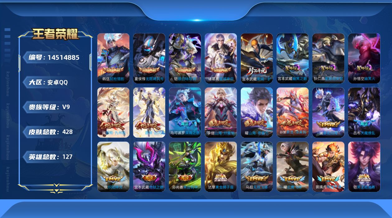 [14514885]【店主推荐捡漏号!可直接换绑】,安卓Q-V9-最强王者段位-127英雄-428皮肤-4典藏皮肤-1珍品传说-33传说-118史诗