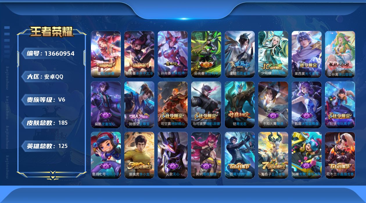 - [11607075]V10 13典藏 9无双 4珍品传说 102传说 124英雄 556皮肤 典藏英雄武则天 可修改实名 优质装备:天鹅之梦(小乔典藏),星空梦想(太空人),倪克斯神谕(宇宙婆娘),鸣剑·曳影,星域神启(倪克斯贼亮),九霄神辉(木兰典藏),赤影疾锋,银白咏叹调(倪克斯侍卫),幻阙歌(貂蝉典藏),弑枪猎影(韩信典藏),真我赫兹(瑶)(瑶无双),神器·明辉仪,青丘·九尾(妲己无双),碎月剑心(李白无双),神鉴启示录,小乔时之魔女(小乔无双),韩信群星魔术团(韩信无双),花合斗,拾光映像(瑶典藏),雪境奇遇-甄姬,器灵·螭龙剑,最初的交响(伽罗典藏),江户川柯南,怪盗基德,器灵·落星盏,黄金狮子座,黄金射手座,冠军飞将,云鹰飞将(小将军),绛天战甲(鸡嘴战神),黄金白羊座,猫影幻舞,久胜战神,炽阳神光,一念神魔,云霓雀翎,末日机甲-孙尚香(绿蚂蚱),地狱火,仲夏夜之梦(大飞蛾),音你心动-小乔,海洋之心,飞鸢探春,音你心动-周瑜,胖达荣荣,乞巧织情,时之恋人-刘备(电焊工),游龙清影(小青龙),超时空战士-狄仁杰,花朝如约(花篮子),挚爱之约,挚爱花嫁,无双飞将,音你闪耀(rap皮),神器·狴犴令,神器·明辉仪,山海·炽霜斩(李信年限),山海·琳琅生(小乔年限),山海·苍雷引(电光曜子),炽翼辉光(娃娃菜牛角包),画中仙,浮生妄,记忆之芯(机甲兔),青丘·九尾,百相守梦(张飞),追逃游戏(亚瑟),追逃游戏(安琪拉),电玩·雷克斯,鹤羽星尊,灼幽烈阳,妄想实况,妄想奇谈,鹤归松栖(云缨),遇见神鼓,鲁班七号-时之奇旅,大乔-时之奇旅,永恒水手月亮,夜礼服假面,小动物乐团,霜月吟,澜逐花归海,艾琳觅芳踪,琥珀纪元铠,琥珀纪元马超,金乌负日,黄金天蝎座,云中君群星魔术团,朵莉亚心动手记,千劫归真 珍品传说:时之奇旅-孙策 传说皮:乘龙·问璇玑(孙尚香年限),乘龙·铭钟鼎(赵云年限),乘龙·淬吴钩(孙策年限),貂蝉曦玄引,吕布曦玄引,典韦战鼓燎原,落雪白狼,幻光神枪 珍宝阁皮:妄想食味,优雅恋人,蔷薇恋人 限定皮:愿照·九州拓(澜年限),愿照·福禄聚(蔡文姬年限),愿照·岁时盈(虞姬年限),愿照·山河定(司空震年限),愿照·众生和(妲己年限),愿照·千秋盛(女娲年限),映山客,陌上桑,鸣野蒿,至尊宝,白虎志(电光耗子),凤求凰(白切鸡),凤凰于飞,太华(伽罗年限),武陵仙君(小桃