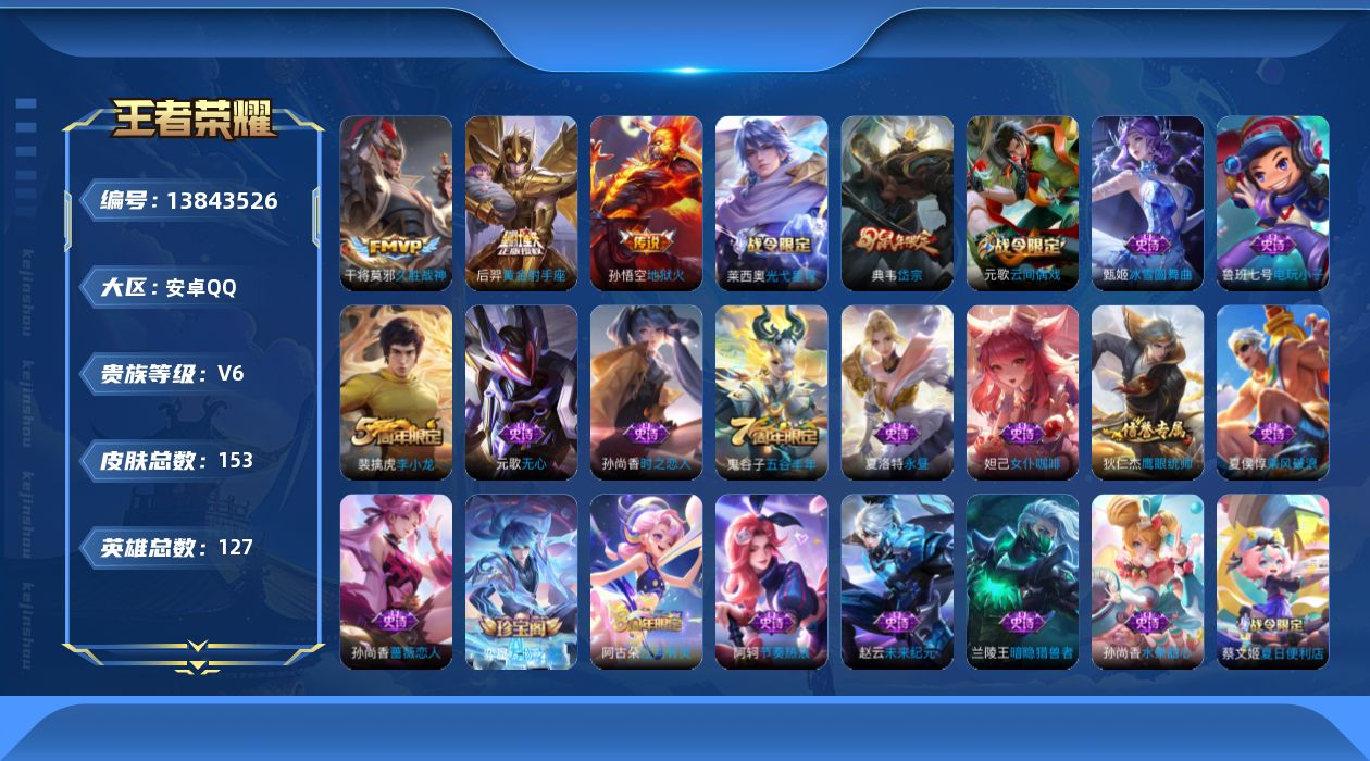 [13843526]【店主推荐捡漏号!可直接换绑】安卓Q-V6-最强王者段位-127英雄-153皮肤-4传说-32史诗