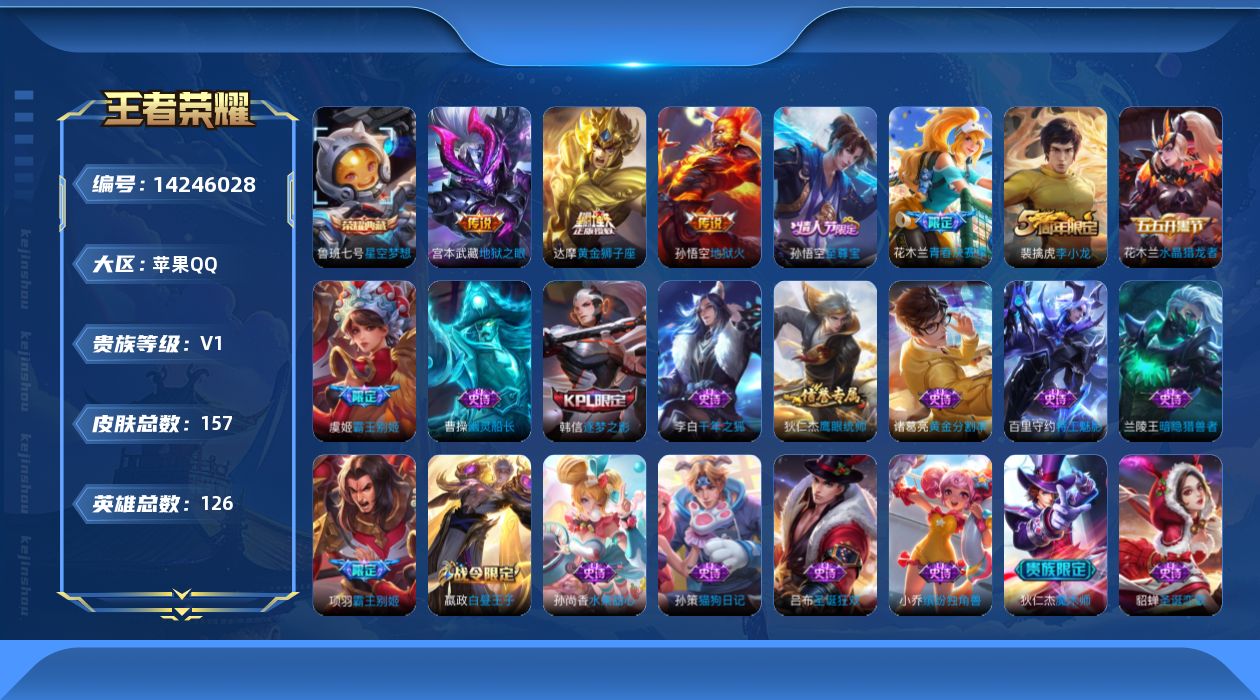 - [11738278]V10 2典藏 2无双 59传说 126英雄 440皮肤 典藏英雄武则天 可修改实名 优质装备:天鹅之梦(小乔典藏),杀手不太冷,韩信群星魔术团(韩信无双),天机白泽,黄金狮子座,黄金射手座,冠军飞将,云鹰飞将(小将军),黄金白羊座,猫影幻舞,久胜战神,炽阳神光,一念神魔,云霓雀翎,末日机甲-孙尚香(绿蚂蚱),地狱火,仲夏夜之梦(大飞蛾),地狱之眼,飞鸢探春,音你心动-周瑜,胖达荣荣,李逍遥,乞巧织情,时之恋人-刘备(电焊工),游龙清影(小青龙),超时空战士-狄仁杰,末日机甲-孙策,花朝如约(花篮子),无双飞将,神器·狴犴令,灼幽烈阳,惊梅引,小动物乐团,霜月吟,澜逐花归海,艾琳觅芳踪,金乌负日,黄金天蝎座,牧神诗旅 传说皮:乘龙·问璇玑(孙尚香年限),乘龙·铭钟鼎(赵云年限),乘龙·淬吴钩(孙策年限),貂蝉曦玄引,吕布曦玄引,典韦战鼓燎原,落雪白狼,九山相柳,云诺千山,祥瑞亨通,幻光神枪 珍宝阁皮:妄想食味,女武神,玩趣恶龙 限定皮:愿照·千秋盛(女娲年限),鸣野蒿,至尊宝,白虎志(电光耗子),凤求凰(白切鸡),凤凰于飞,太华(伽罗年限),武陵仙君(小桃花),傲雪梅枪,时之彼端,白鹤梁神女,神威(电光马子),飞衡(韩信年限),玄嵩(庄周年限),山海·碧波行(瑶年限),遇见飞天,高山流水,诗剑行,怒海麟威,五谷丰年,幽恒(沐浴露),梁祝,御风骁将(吕布年限),岱宗(典韦年限),天狼征服者,天狼绘梦者,李小龙,逐梦之影,朱雀志(守约年限),永曜之星,辉光之辰,如梦令-嫦娥,如梦令-后羿,圣诞老人,一生所爱,大圣娶亲,天魔缭乱,冰霜恋舞曲,乒乒小将,蜜橘之夏,时之祈愿-瑶(瑶传限),枫霜尽,山海·玄木吟(马可年限) 史诗皮:赞萌露比,苍鳞隐世,灵蛊蚀心,星界战将,龙之律动,石田雨龙,百相守梦-周瑜,幻珠鲛人,奇遇星旅,蔬乡物语(鲁班七号),乘龙·聚宝船(安琪拉年限),乘龙·忆丹青(大乔年限),百相守梦-黄忠,遇见神鹿,紫霞仙子,苍穹之光,电玩小子(小书包),白龙吟,黄金分割率,特工魅影,千年之狐,永昼,魅语,高渐离燃音魔法,蒙恬荣光圣徽,无限星赏官,冰冠公主,青蛇,偶像歌手,白蛇,晚萤,龙骑士(小龙虾),末日机甲-吕布,猫狗日记-孙策,猫狗日记-大乔,时之恋人-孙尚香,乱世虎臣,节奏热浪,修罗,女仆咖啡,摇滚巨星,水果甜心,绅士熊喵,天才门将,星夜王子,心灵骇客,功