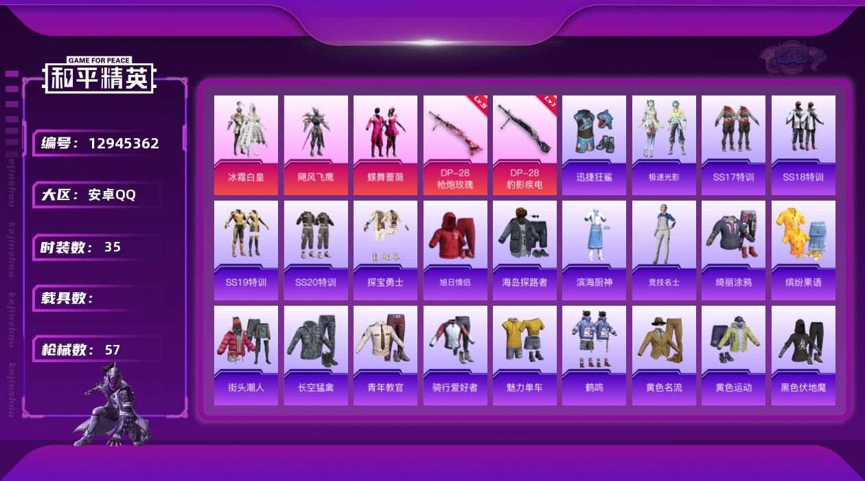 [12945362]【暑期末清货/特价急出/永久包赔】:安卓 手Q-3粉装-2特效枪-1.3w热力值-4印记-35套装-57枪皮【特效枪等级】:DP-28-枪炮玫瑰(五级),DP-28-豹影疾电(一级)【优质套装】:粉装-冰霜白皇,粉装-飓风飞鹰,粉装-蝶舞蔷薇