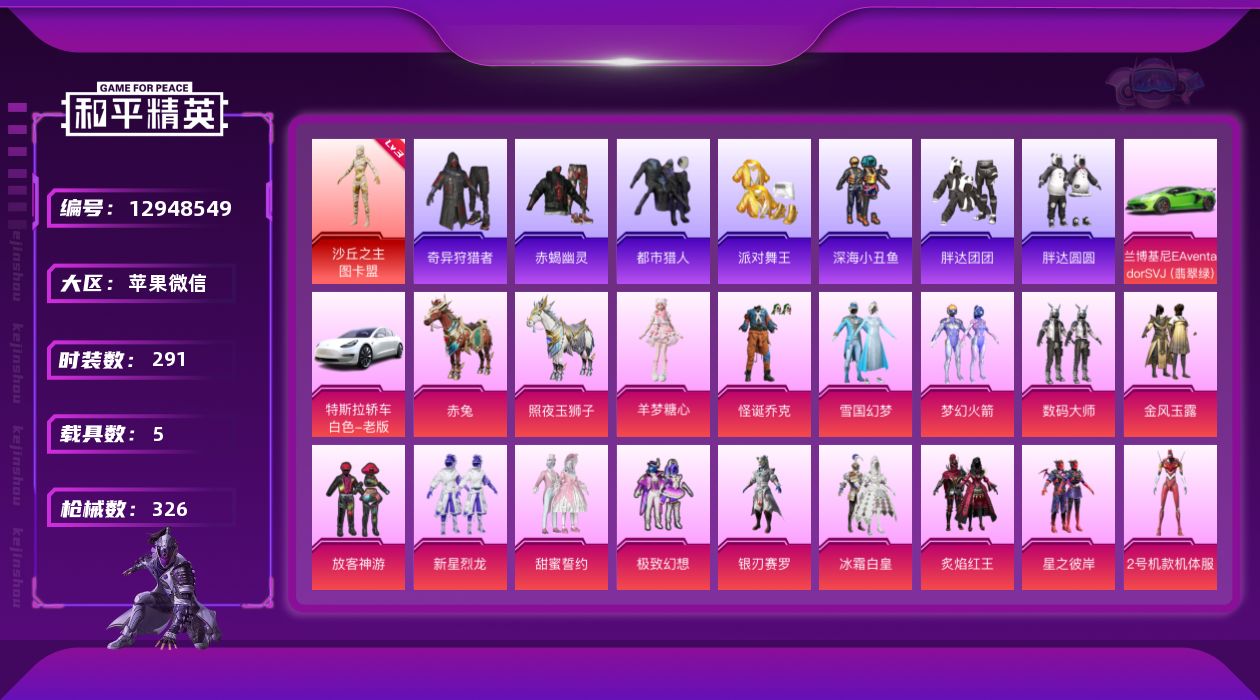 - [14258604]安卓 手Q-6神装-20粉装-19特效枪-7载具-16粉色飞行器-98718热力值-5王牌印记-158套装-237枪皮 【红色神装等级】:沙丘之主-图卡盟(三级)!圣域龙灵-瑞拉(一级)!金蛇镇世-烛九(二级)!盛世惊鸿-云鸾(一级)!宇宙意志-塞卢姆(一级)!墨龙九天-敖渊(一级)! 【红色角色神装】:圣域龙灵-瑞拉,金蛇镇世-烛九,盛世惊鸿-云鸾,宇宙意志-塞卢姆,墨龙九天-敖渊,沙丘之主-图卡盟 【热门品类】:角色-军刀雅典娜,套装-龟仙人,套装-浪漫波比,套装-粉红小猪,角色-六号稻草人 【粉色载具】:玛莎拉蒂Ghibli(粉),疾风龙骑,盛世惊鸿摩托车,最终圣卫者摩托车,僚机-圣域龙宝,星梦玉骢,护世瑞兽,晶梦灵驹 【粉色套装】:粉装-冰霜白皇,粉装-炙焰赤龙,粉装-飓风飞鹰,粉装-蜜桃特工,粉装-林间仙鹿,粉装-彩虹鹿灵,粉装-齐天大圣,粉装-蓝莓炮弹,粉装-赤焰黑爵,粉装-星夜魔法师,角色-烟云彩露,角色-星梦奇缘,角色-月影灵韵,角色-女娲灵识,角色-晶梦幻蝶,角色-智耀战神,粉装-幻彩电音,角色-狂魅哈莉,角色-狂魇小丑,角色-宁雨蝶 【粉色枪皮等级】:AKM-魔法神域(三级),AKM-幽焰骑士(三级),M16A4-晶梦幻蝶(二级),SCAR-L-金蛇镇世(六级),M416-墨龙九天(三级),UMP45-宇宙意志(三级),Vector-最终圣卫者(三级),AKS-74U-星穹咏叹调(一级),P90-沙丘之主(三级),Kar98K-巳巳如意(五级),Kar98K-圣域龙灵(三级),M24-镜域双华(三级),Mk14-盛世惊鸿(一级),Mk14-樱桃泡泡(一级),DP-28-豹影疾电(一级),MG3-洛神天依(七级),MG3-辉羽雀灵(二级),烟雾弹-丁香清露(五级),破片手榴弹-瓶中星球(四级) 【粉色枪皮】:AKM-魔法神域,AKM-幽焰骑士,M16A4-晶梦幻蝶,SCAR-L-金蛇镇世,M416-墨龙九天,UMP45-宇宙意志,Vector-最终圣卫者,AKS-74U-星穹咏叹调,P90-沙丘之主,Kar98K-巳巳如意,Kar98K-圣域龙灵,M24-镜域双华,Mk14-盛世惊鸿,Mk14-樱桃泡泡,DP-28-豹影疾电,MG3-洛神天依,MG3-辉羽雀灵,烟雾弹-丁香清露,破片手榴弹-瓶中星球 【粉色飞行器】:酣梦熊熊飞行器,相思残雪飞行器