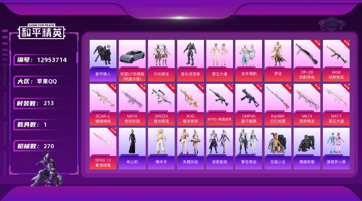 [12953714]素材身法号/地铁满天赋【特价急出/详情看图】:苹果 手Q-5粉装-12特效枪-1载具-3粉色飞行器-8.1w热力值-18王牌印记-213套装-270枪皮【热门品类】:套装-浪漫天命,套装-都市猎人,套装-小丑鱼,套装-龟仙人,套装-暗影哥特,角色-8号机,角色-Mark.06,熔岩游骑兵面罩,熔岩游骑兵连帽夹克【粉色载具】:仰望U7(阿盖尔紫)【粉色套装】:粉装-闪光银龙,角色-复仇流浪者,粉装-第五大道,粉装-金丰海韵,角色-罗征【粉色枪皮等级】:AKM-绿萝繁花(五级),SCAR-L-锦绣绵绵(五级),M416-电玩时刻(五级),GROZA-镜光银凌(五级),AUG-暖羊咩咩(五级),M762-青锋波束(五级),UMP45-量子极限(五级),Kar98K-巳巳如意(五级),Mk14-甜梦熊击(五级),M417-第五大道(四级),SPAS-12-蜜语绒猫(四级),DP-28-豹影疾电(五级)【粉色飞行器】:天之羽翼飞行器,闪光银龙飞行器
