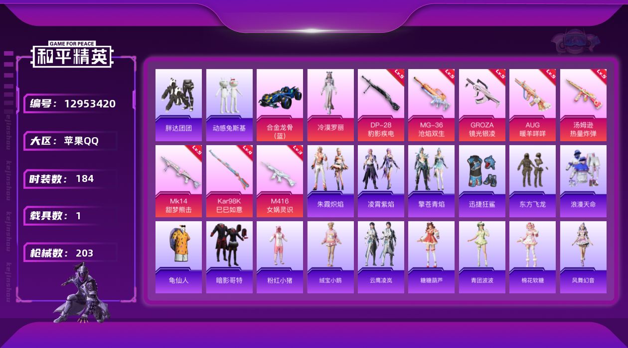 [12953420]素材身法号/无敌战神框3/绝世印记1【特价急出/详情看图】:苹果 手Q-无敌战神框-1粉装-8特效枪-1载具-1粉色飞行器-6.4w热力值-20王牌印记-184套装-203枪皮【热门品类】:套装-浪漫天命,套装-胖达团团,套装-动感兔斯基人偶服,套装-龟仙人,套装-暗影哥特,套装-粉红小猪【粉色载具】:合金龙骨(蓝)【粉色套装】:角色-冷漠罗丽【粉色枪皮等级】:M416-女娲灵识(三级),GROZA-镜光银凌(五级),AUG-暖羊咩咩(五级),汤姆逊-热量炸弹(五级),Kar98K-巳巳如意(四级),Mk14-甜梦熊击(五级),DP-28-豹影疾电(五级),MG-36-沧焰双生(五级)【粉色飞行器】:绯果甜心飞行器