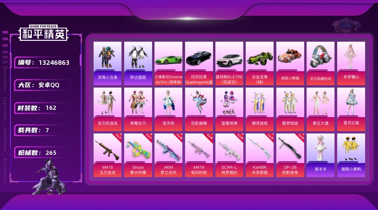 [13246863]素材身法号 安卓 手Q-10粉装-7特效枪-7载具-4粉色飞行器-8.8w热力值-7王牌印记-162套装-265枪皮【热门品类】:套装-深海小丑鱼,套装-小丑鱼,角色-军刀雅典娜,套装-胖达圆圆,套装-龟仙人,套装-潮萌小黄鸭,套装-粉红小猪【粉色载具】:兰博基尼Aventador SVJ(翡翠绿),路特斯ELETRE(花绽灰),玛莎拉蒂Quattroporte(夜幕蓝),合金龙骨(绿),俏皮小熊猫,布尔玛摩托车,僚机-萌兔起飞【粉色套装】:粉装-宝贝奶油派,粉装-草莓生巧,角色-洛天依,粉装-花影阑珊,粉装-蓝莓炮弹,粉装-精灵娃娃,粉装-酣梦娃娃,粉装-第五大道,粉装-雪月幻音,角色-羊梦糖心【粉色枪皮等级】:AKM-梦之光华(五级),SCAR-L-纯梦嫁纱(四级),M416-五爪金龙(七级),M416-电玩时刻(五级),GROZA-香水柠檬(七级),Kar98K-未来歌姬(三级),DP-28-豹影疾电(二级)【粉色飞行器】:心之恋语飞行翼,齐天大圣飞行器,绯果甜心飞行器,时光之吻飞行器