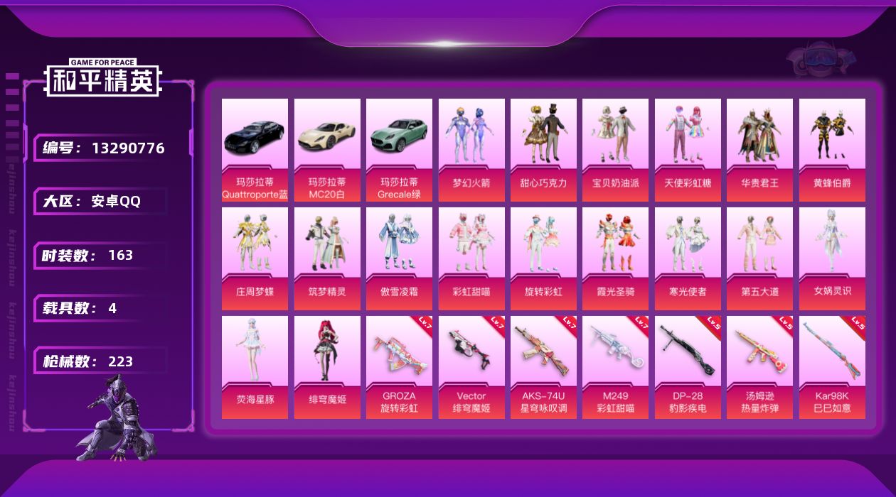 [13290776]女公主裙子号 素材身法号 安卓 手Q-17粉装-11特效枪-4载具-2粉色飞行器-8.4w热力值-10王牌印记-163套装-223枪皮【热门品类】:粉装-梦幻火箭,角色-军刀雅典娜,套装-龟仙人,套装-暗影哥特,套装-浪漫波比,套装-粉红小猪【粉色载具】:玛莎拉蒂MC20(星石白),玛莎拉蒂Quattroporte(夜幕蓝),玛莎拉蒂Grecale(薄荷绿),僚机-萌兔起飞【粉色套装】:粉装-甜心巧克力,粉装-宝贝奶油派,粉装-天使彩虹糖,粉装-梦幻火箭,粉装-华贵君王,粉装-黄蜂伯爵,粉装-庄周梦蝶,粉装-筑梦精灵,粉装-傲雪凌霜,粉装-彩虹甜喵,粉装-旋转彩虹,粉装-霞光圣骑,粉装-寒光使者,粉装-第五大道,角色-女娲灵识,角色-荧海星豚,角色-绯穹魔姬【粉色枪皮等级】:M16A4-垂柳戏鸭(二级),GROZA-旋转彩虹(七级),Vector-绯穹魔姬(七级),汤姆逊-热量炸弹(五级),AKS-74U-星穹咏叹调(七级),Kar98K-巳巳如意(五级),AWM-橘柚倾心(四级),Mk14-甜梦熊击(五级),M417-第五大道(五级),M249-彩虹甜喵(七级),DP-28-豹影疾电(五级)【粉色飞行器】:庄周梦蝶飞行器,太空嘟嘟飞行器