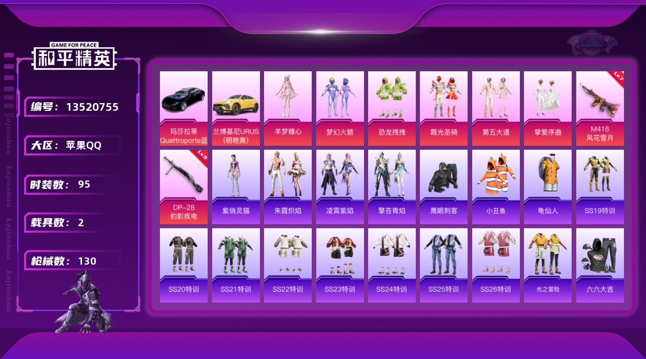 [13520755]苹果 手Q-6粉装-2特效枪-2载具-4w热力值-9王牌印记-95套装-130枪皮【热门品类】:粉装-梦幻火箭,套装-小丑鱼,套装-龟仙人【粉色载具】:兰博基尼URUS(明艳黄),玛莎拉蒂Quattroporte(夜幕蓝)【粉色套装】:粉装-梦幻火箭,粉装-恐龙拽拽,粉装-霞光圣骑,粉装-第五大道,粉装-挚爱序曲,角色-羊梦糖心【粉色枪皮等级】:M416-风花雪月(七级),DP-28-豹影疾电(五级)