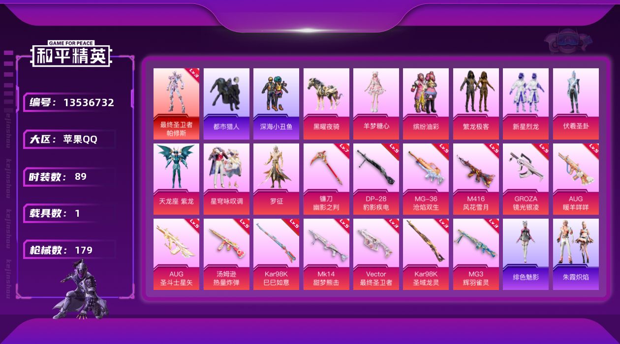 [13536732]不可二次【店主推荐捡漏号!可直接换绑】/素材身法号/地铁满天赋 苹果 手Q-1神装-8粉装-13特效枪-1载具-7粉色飞行器-5.4w热力值-3王牌印记-89套装-179枪皮【红色神装等级】:最终圣卫者-帕修斯(三级)【热门品类】:粉装-缤纷油彩,粉装-繁龙极客,套装-浪漫天命,套装-都市猎人,套装-深海小丑鱼,套装-小丑鱼,套装-暗影哥特,套装-粉红小猪【粉色载具】:黑曜夜骑【粉色套装】:粉装-缤纷油彩,粉装-新星烈龙,粉装-繁龙极客,角色-伏羲圣卦,角色-天龙座 紫龙,粉装-星穹咏叹调,角色-罗征,角色-羊梦糖心【粉色枪皮等级】:M416-风花雪月(五级),GROZA-镜光银凌(五级),AUG-暖羊咩咩(五级),AUG-圣斗士星矢(五级),Vector-最终圣卫者(三级),汤姆逊-热量炸弹(五级),Kar98K-巳巳如意(五级),Kar98K-圣域龙灵(三级),Mk14-甜梦熊击(五级),DP-28-豹影疾电(五级),MG3-辉羽雀灵(三级),MG-36-沧焰双生(五级),镰刀-幽影之判(七级)【粉色飞行器】:镜光幻境飞行翼,圣域金龙飞行器,绯果甜心飞行器,雀灵庇佑飞行器,终晖之翼飞行器,灵猫魔法师飞行器,飞天猪飞行器