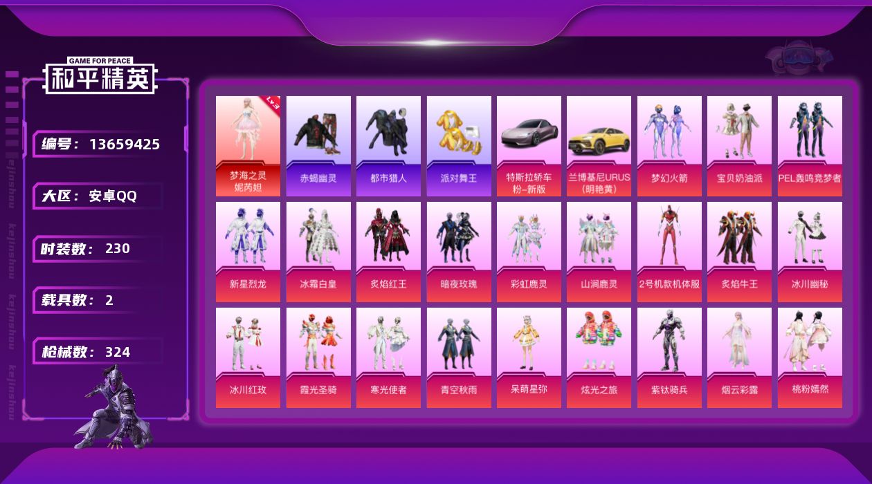 - [15111977]【特价出售/店主推荐】苹果 微信-无敌战神框-2神装-20粉装-18特效枪-11载具-12粉色飞行器-133270热力值-23王牌印记-199套装-307枪皮 【红色载具】:路特斯ELETRE(电光紫)(六级) 【红色神装等级】:辉羽雀灵-初翊(五级),镜域双华-欧若拉(一级) 【红色角色神装】:辉羽雀灵-初翊,镜域双华-欧若拉 【热门品类】:粉装-缤纷油彩,套装-冥河战士,套装-星河浪客,套装-龟仙人,套装-粉红小猪,角色-Mark.06 【粉色套装】:粉装-天使彩虹糖,粉装-缤纷油彩,粉装-狩月元帅,粉装-甜蜜誓约,粉装-迷蝶贵族,粉装-翡翠骑士,粉装-炙焰红王,粉装-精灵娃娃,粉装-薄荷物语,粉装-筑梦精灵,粉装-冰川幽秘,粉装-冰川红玫,粉装-第五大道,角色-烟云彩露,角色-晶梦幻蝶,粉装-幻影飞狐,粉装-幻彩电音,角色-绯月迷踪,角色-绯穹魔姬,角色-羊梦糖心 【粉色枪皮等级】:AKM-炫紫旋律(七级),SCAR-L-锦绣绵绵(五级),SCAR-L-魔童闹海 哪吒(一级),M416-心之恋语(七级),M762-甜心娃娃(七级),Vector-绯穹魔姬(一级),野牛-绯月迷踪(二级),P90-魔童闹海 敖丙(一级),Kar98K-伏魔团(四级),Kar98K-巳巳如意(五级),M24-星之信仰(五级),M24-镜域双华(三级),Mini14-荧光虫舞(五级),DP-28-豹影疾电(五级),MG3-洛神天依(五级),MG3-辉羽雀灵(三级),MG-36-沧焰双生(四级),烟雾弹-丁香清露(五级) 【粉色载具】:特斯拉Model 3(冷光银),路特斯ELETRE(电光紫),宝马M4(圣保罗黄),霜龙神御(云雾蓝),保时捷911 敞篷版(星珀红),保时捷Taycan 旅行版(冰莓粉),合金龙骨(绿),双人摩托-梦幻火箭,僚机-萌兔起飞,晶梦灵驹,冰绡玉鳞,辉羽雀灵自行车 【粉色枪皮】:AKM-炫紫旋律,SCAR-L-锦绣绵绵,SCAR-L-魔童闹海 哪吒,M416-心之恋语,M762-甜心娃娃,Vector-绯穹魔姬,野牛-绯月迷踪,P90-魔童闹海 敖丙,Kar98K-伏魔团,Kar98K-巳巳如意,M24-星之信仰,M24-镜域双华,Mini14-荧光虫舞,DP-28-豹影疾电,MG3-洛神天依,MG3-辉羽雀灵,MG-36-沧焰双生,烟雾弹-丁香清露 【粉